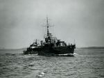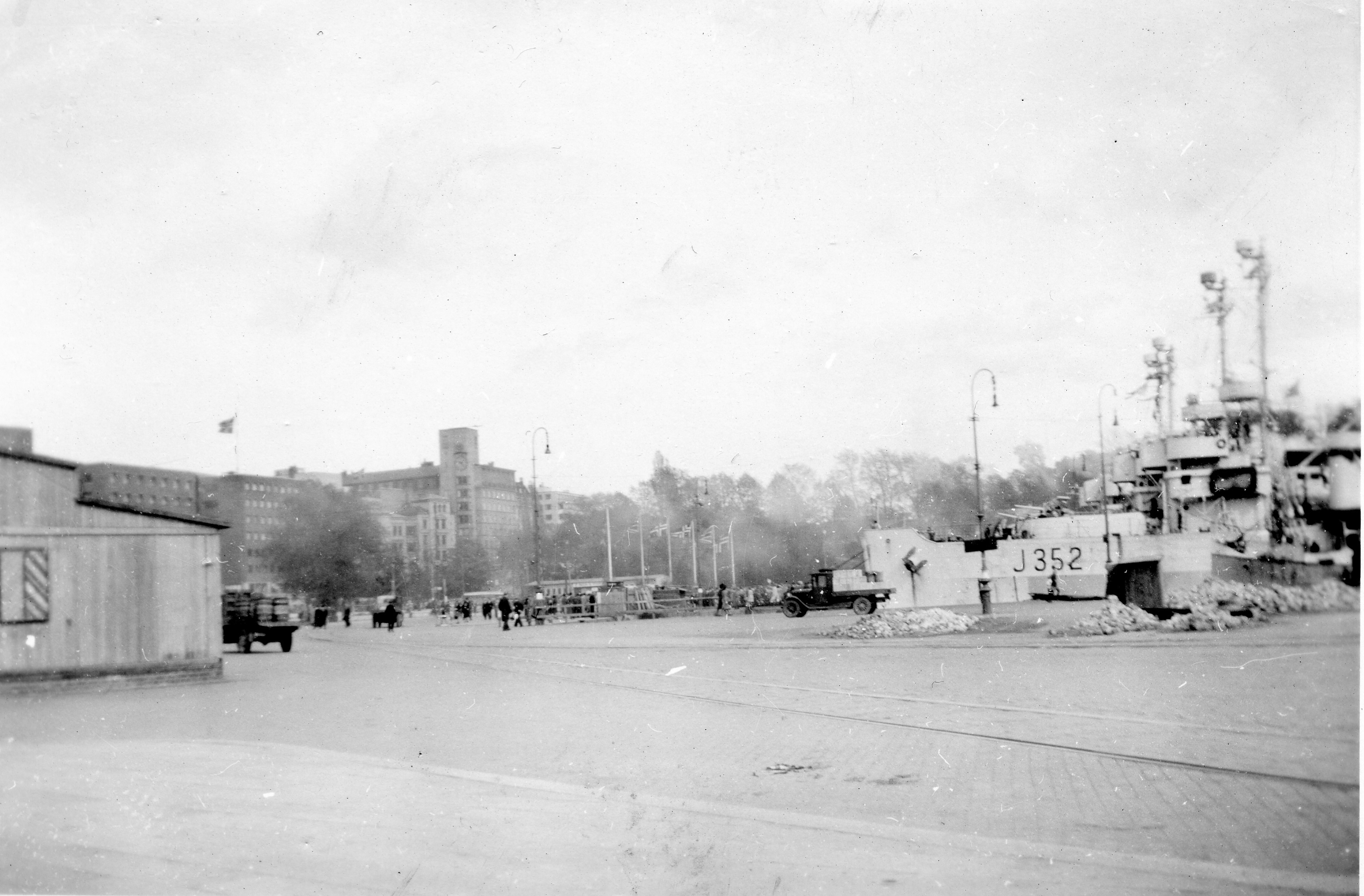 (RTL-LRB026) On August 26 1944, HMCS IROQUOIS met a small boat from Ile d'Yeu, a small channel Island. On board was the local school teacher who stated the Germans had left the Channel Island the day before. In their retreat the post office, radar installations and lighthouse had been destroyed, nineteen citizens and the mayor were also taken as prisoners. IROQUOIS sent a shore party ashore with supplies, food, chocolate, cigarettes and signalling equipment. The IROQUOIS sailors stepped ashore to much celebration. Remaining on the island overnight, the next morning there was a service at the graves of allied airmen, the sailors returned to IROQUOIS with details of enemy positions, minefields and shore defences. The locals also showered the sailors with flowers and a large iced cake, for IROQUOIS was the first allied force to arrive on the island (see also RTL-LRB007) (RTL-LRB027) German merchant ship in Copenhagen in May 1945. Photo taken from HMCS IROQUOIS (RTL-LRB028) A local child poses with a Canadian sailor from HMCS IROQUOIS as he writes a letter while in Oslo, Norway in May 1945 (RTL-LRB029) Several Catherine class minesweepers in Oslo, Norway in May 1945. HMS GRECIAN (J352) is facing. Photo taken by Lynfourd Boune in HMCS IROQUOIS