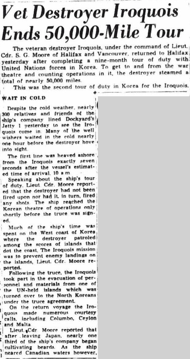 * After both her 2nd and 3rd Korean War tours, IROQUOIS returned to Canada via the Suez Canal thus circumnavigating the globe. Following her Korean tours, she returned to her training role.