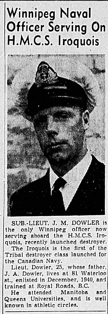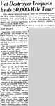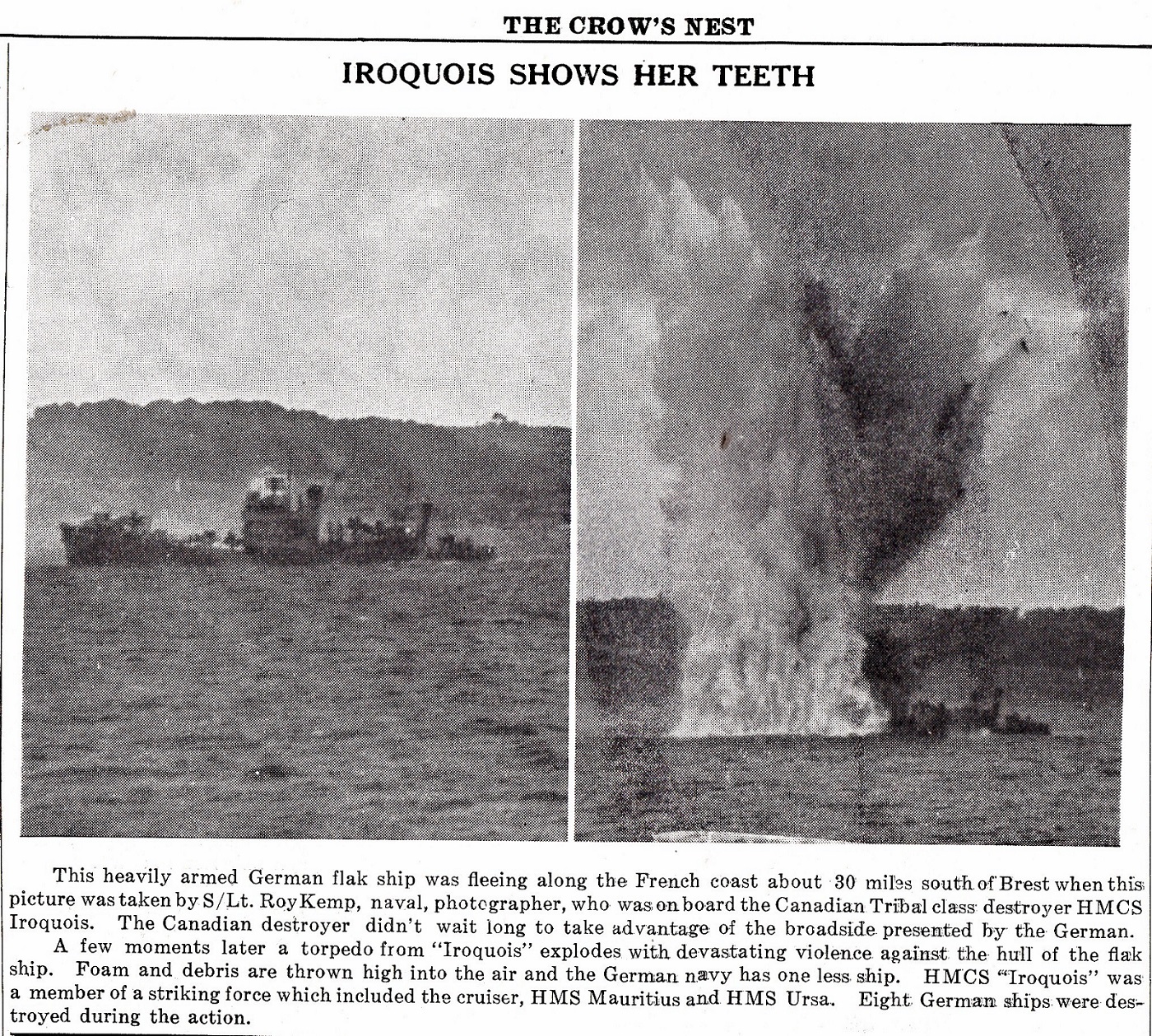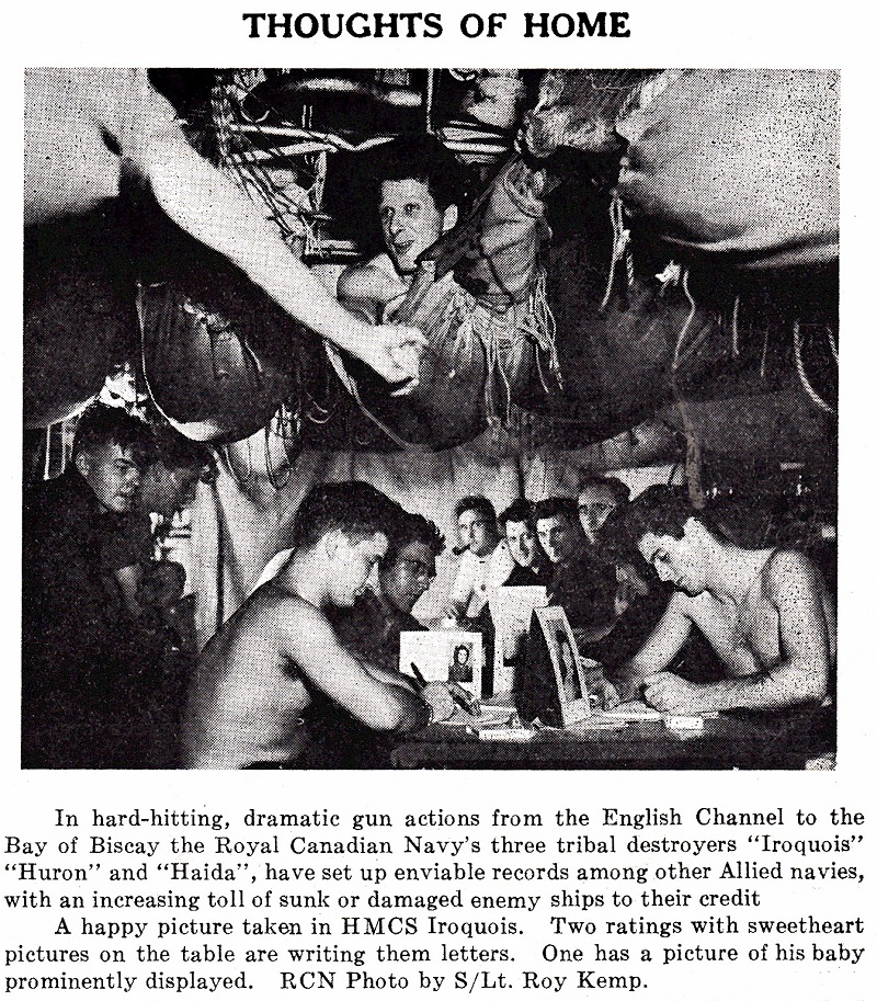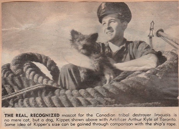 (IRQ014) IROQUOIS SHOWS HER TEETH // Newspaper article on HMCS IROQUOIS G89 sinking German Flak ship off France // Crow's Nest Newspaper - Nov 1944 // Historical note: This action happened on 23 Aug 1944 as part of the Battle of Audierne Bay. IROQUOIS sank a flak ship by gunfire. This photo is of a German minesweeper being torpedoed by IROQUOIS, not the sinking of the Flak ship as indicated in the news article. (IRQ015) ERA Arthur Kyle on HMCS IROQUOIS G89 with the ship's mascot, Kipper // Courtesy of Tim Kyle (IRQ016) Newspaper article on SLt J.M.Dowler, HMCS IROQUOIS // The Winnipeg Evening Tribune, 06 Apr 1943 (IRQ017) Sailors or HMCS IROQUOIS write letters home // Crow's Nest newspaper - Dec 1944 (IRQ018) Two sailors on HMCS IROQUOIS display a wartime souvenir // Sto Jules Barron and Sto Joseph Harold // Crow's Nest newspaper - Dec 1944