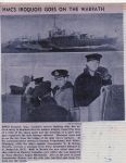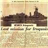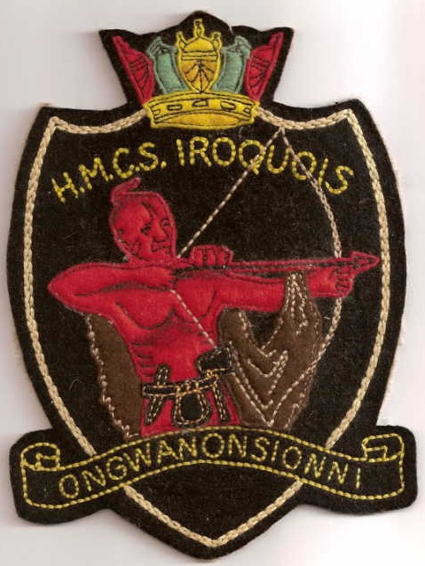 (IRQ006) Article on HMCS IROQUOIS G89 joining the Home Fleet after a round trip to Canada (IRQ007) HMCS IROQUOIS G89 // Courtesy of Dave Shirlaw (IRQ008) Man Overboard - Ernest G. Edward fell over board while serving in HMCS IROQUOIS during the Second World War. He was rescued. // Courtesy of Terrance Edwards (IRQ009) HMCS IROQUOIS G89 covered in ice in the North Atlantic // Courtesy of Bill Gard (IRQ010) Jacket patch for HMCS IROQUOIS G89 // Courtesy of Terrance Edwards // From the book Designs of Distinction : In his book "Tribal Captain", in a photograph between pp 100 and 101, Edward TG Madgwick, retired Captain, RCN, says he produced this design as 1st Lieutenant of IROQUOIS when she commissioned. the design came from a book on the IROQUOIS nation found in an English library. The design became a jacket patch in 1945. Minus the rope shield, this design appeared on the ship's stationary, but in black and white.