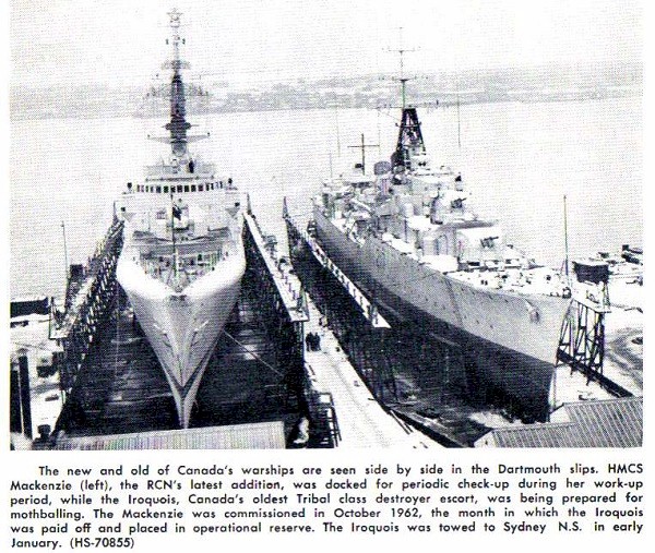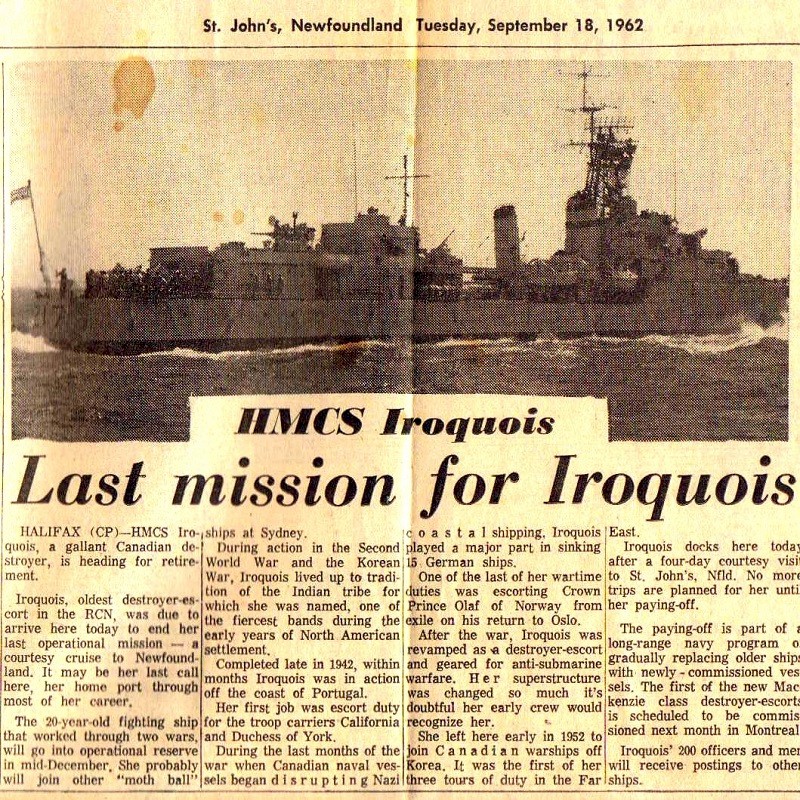 From Bermuda, the Squadron proceeded to Newfoundland where on 12 Sep to 17 Sep 1962, the Squadron took part in the 67th annual meeting of the National Council of the Navy League of Canada. While at St. John's, the squadron's actives included onboard entertainment of local dignitaries, day cruises for members of HMCS AVALON, HMCS CABOT and RCSCC Terra Nova and open house to the general public. Prior to leaving port IROQUOIS was advised to wear our "Paying off Pennant" upon leaving harbour, as this was to be her last port of call. On 24 Oct 1962, IROQUOIS was paid off at Halifax and placed in operation reserve (Moth balled) Point Edward Naval Station, Cape Breton N.S. She was broken up at Bilbao, Spain, in 1964.
