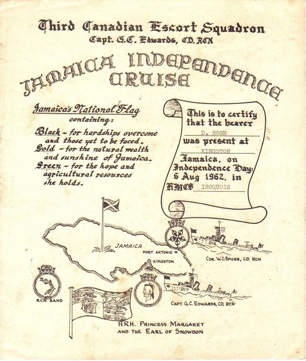On 30 Jul 1962, the RCN sent the 3rd Destroyer Escort Squadron (Atlantic), under Capt. Gordon Edwards, on a good will / work up tour. The squadron consisted of HMCS SIOUX 225, HMCS HURON 216 and HMCS IROQUOIS 217 (as flagship). The ships sailed from Halifax NS to Bermuda and then on to Jamaica, arriving on 05 August 1962. The squadron joined a large fleet of naval vessels already assembled, as all Royal Navies and the United States Navy, had sent "good will" ships of various classes to Jamaica. In essence, it served to form one of the largest allied fleets to be assembled since WW II, and spent six days in Jamaica celebrating their independence from Briton which occurred on 06 Aug 1962. The squadron then sailed back to Bermuda before heading to Prince Edward Island to par-take in their official Lobster Festival. From PEI the squadron returned to Halifax for fuel and provisions, and again departed for Bermuda. From Bermuda it was onto Trinidad & Tobago to take part in their independence celebrations.