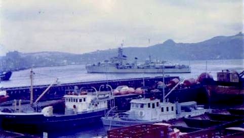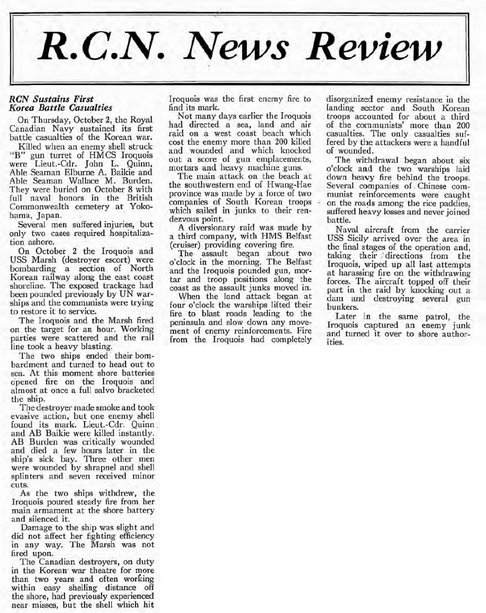 IROQUOIS completed 3 tours of duty in the Korean theatre. During her first tour, on October 2, 1952, IROQUOIS was making a daylight interdiction bombardment on a coastwise stretch of the main North Korean railway line when she received fire from the shore battery. A shell hit “B” gun deck and killed LCdr Quinn and AB Baikie instantly. AB Burden was critically wounded and died several hours later.