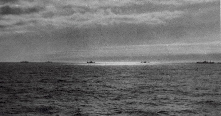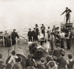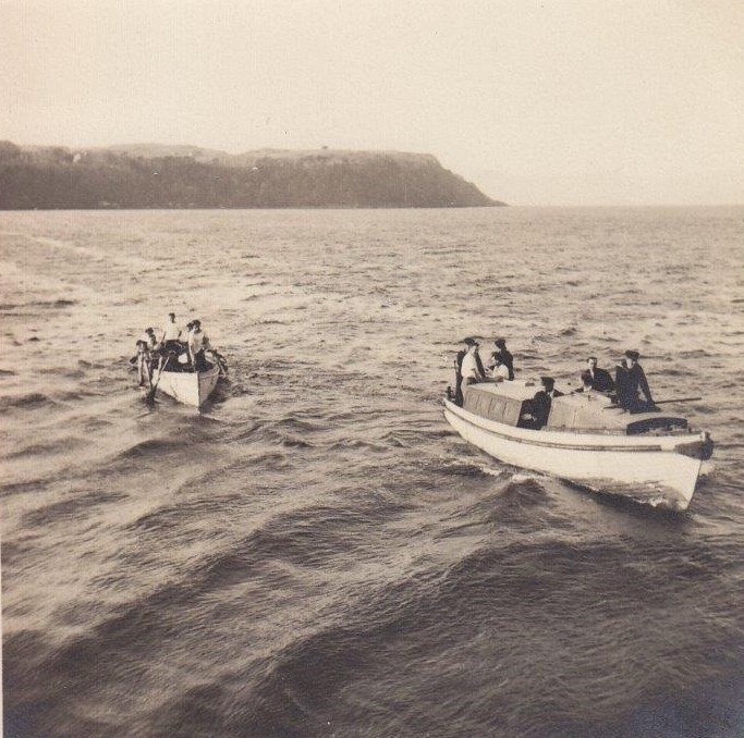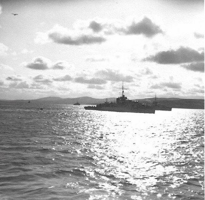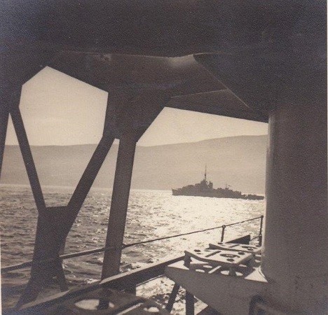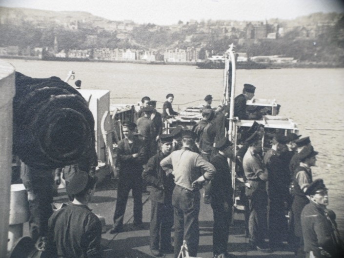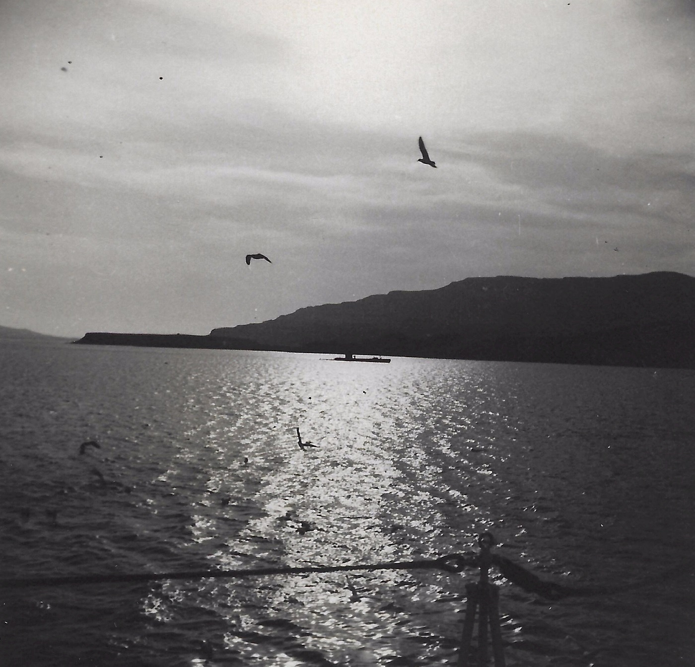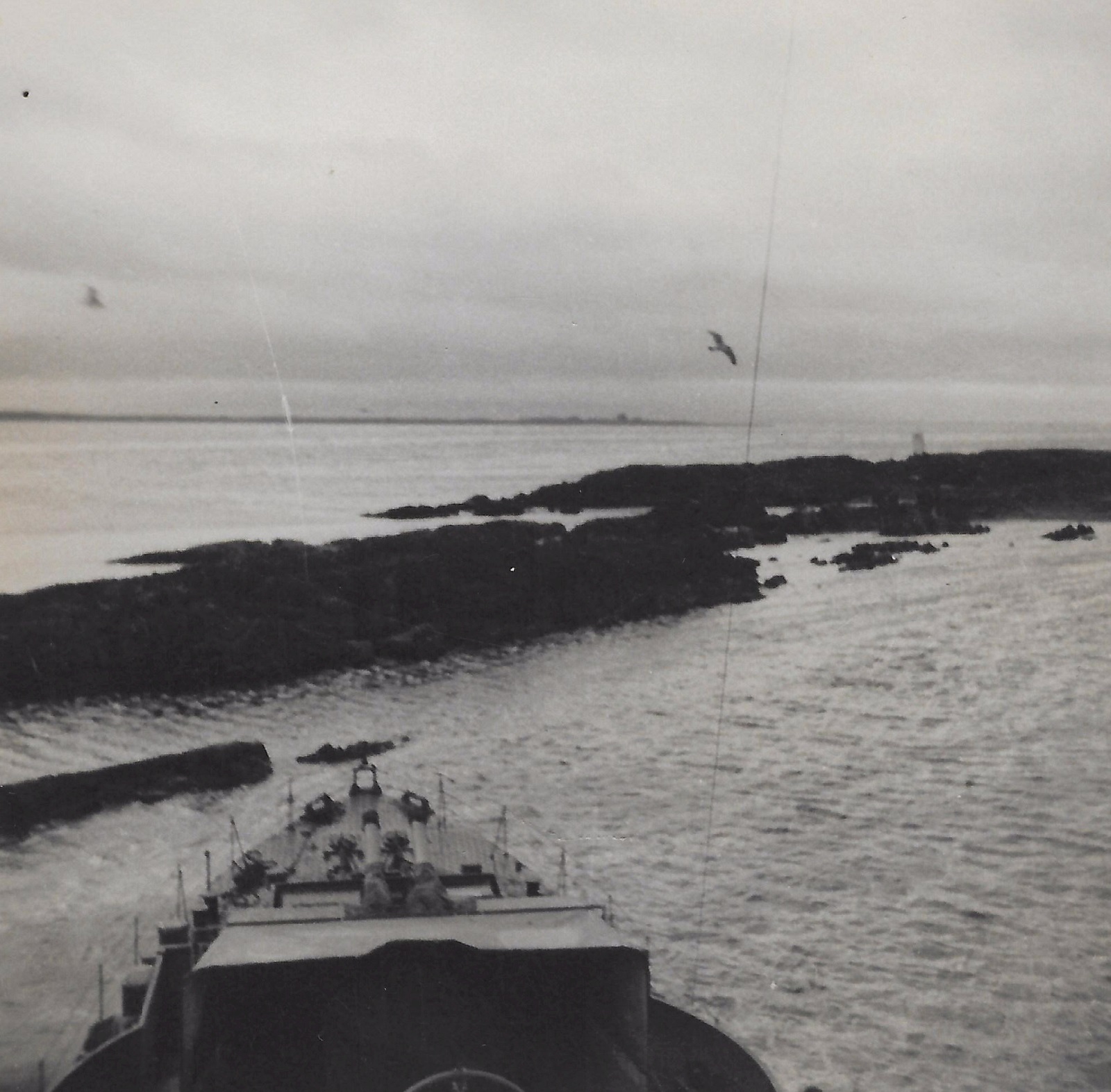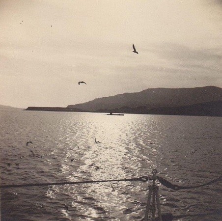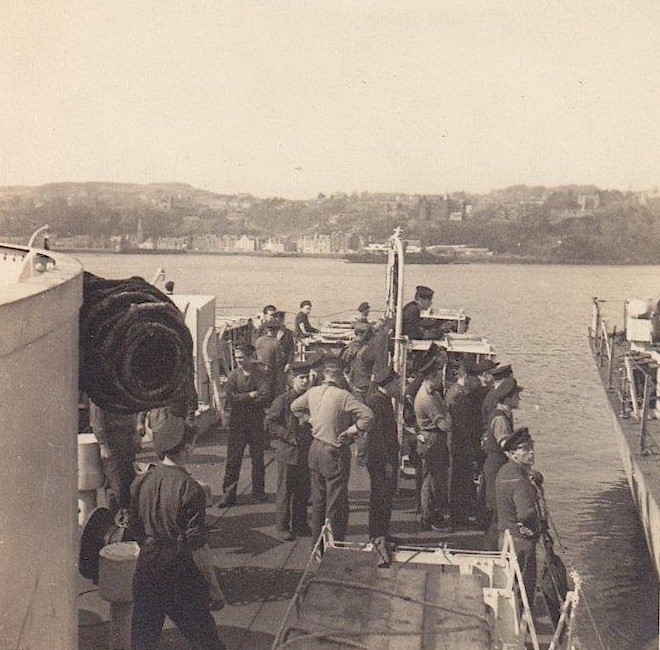 Note: photo WM73: William described the burial at sea of the mascot as off the coast of Laine - however no maps show any such coastal area. From William's daughter: It may possibly be Larne, which is just north of Belfast along the coast. He sent 90% of his photos to his parents, who were also originally from Belfast, so he may have been referring to an area they were familiar with. Now if the ship came out of Londonderry and went up to Tobermory it may have been in the waters north of Larne. Other than that, I can only guess he may have used a local term to describe a coastal area.