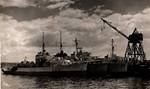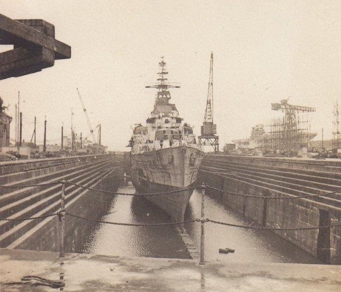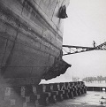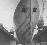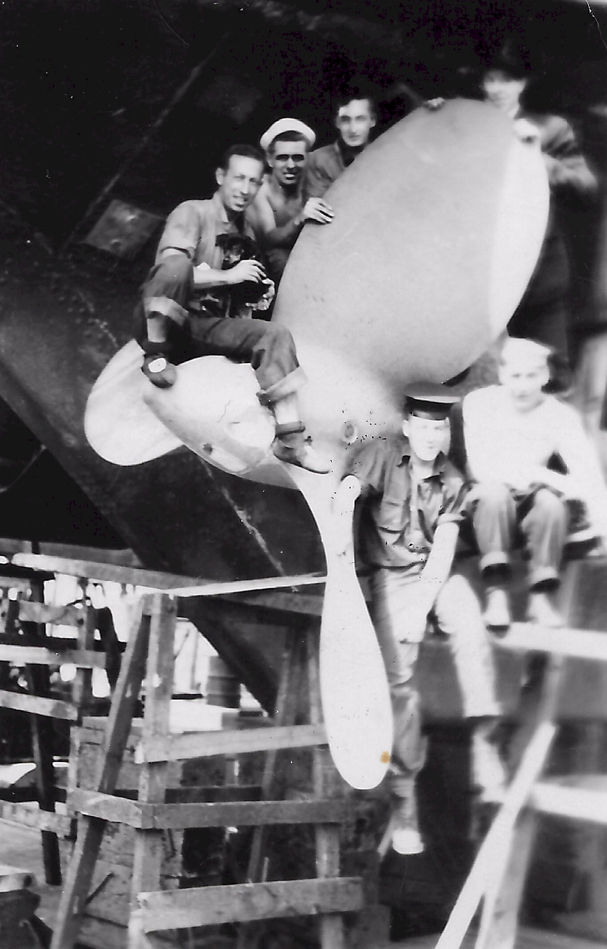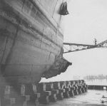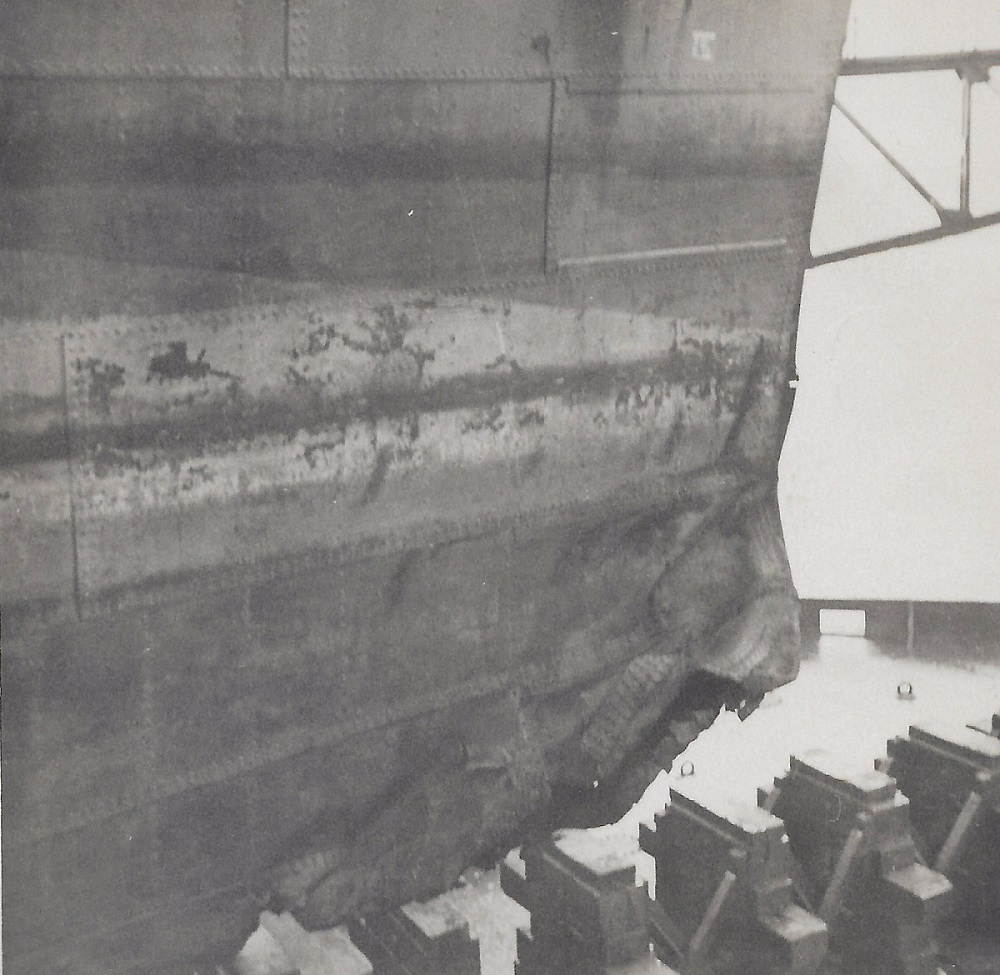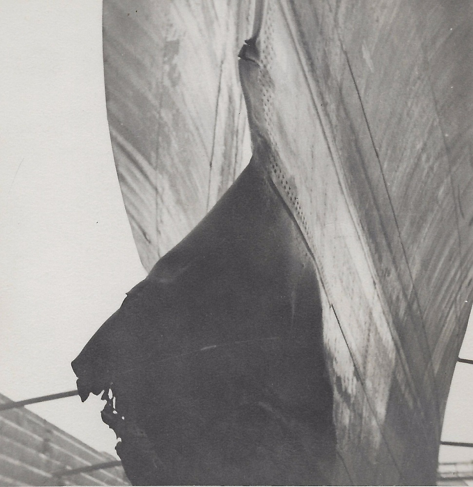 (WM72) Looking up at JOLIETTE's bow from the dry dock (WM73) Members of JOLIETTE's around the ship's screw while she is in dry dock in Londonderry. "See our mascot? Curly has her in his arms. She died at sea and was buried off the coast of Laine"