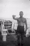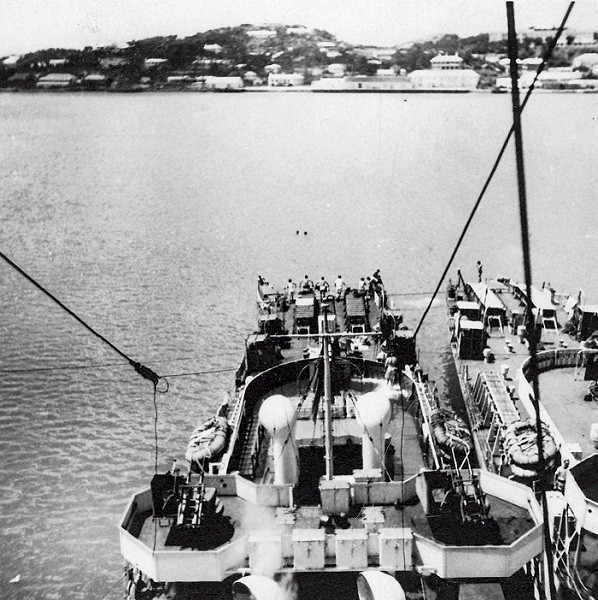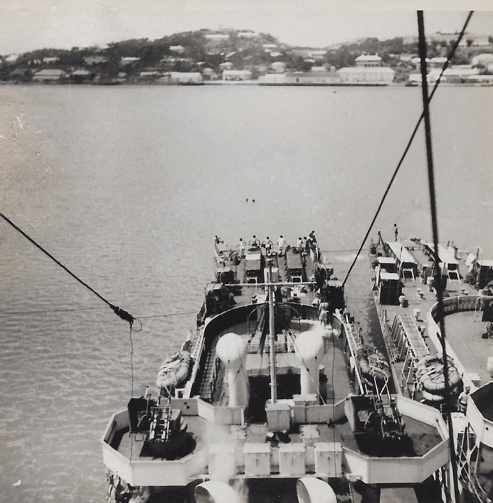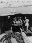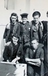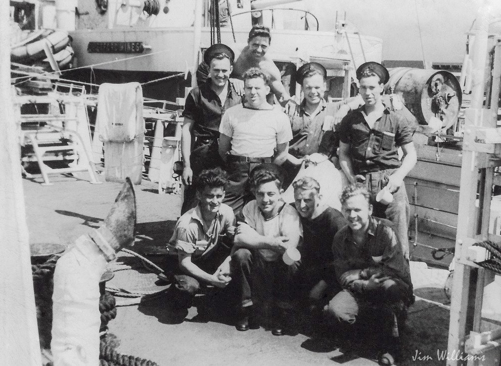 (JTW013) "SPLICE THE MAINBRACE!" // VE Day on HMCS JOLIETTE K418 at Moville, Loch Foyle // J.T. Williams standing against the guard rail holding a white mug in his right hand (JTW014) "SPLICE THE MAINBRACE!" // VE Day on HMCS JOLIETTE K418 at Moville, Loch Foyle // J.T. Williams at the front of the photo, first man on left (JTW015) HMCS JOLIETTE K418 in Bermuda (JTW016) Sailors on HMCS JOLIETTE K418 // Names on back of photo - no particular order. Nine sailors in photo - eight names on the back of the photo. // J.T. Williams (front, 2nd from left), E. Overstrud, Frenchie Dalke, Bill Newman, Fred Haslan (standing, 2nd from right), Ray Belliveau, B. Simpson and W. Bowes // HMCS THETFORD MINES is in the background From the collection of J.T. Williams Courtesy of Jim Williams