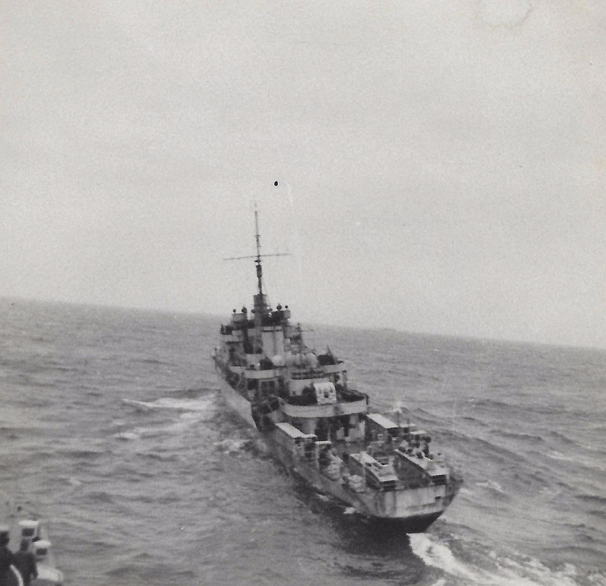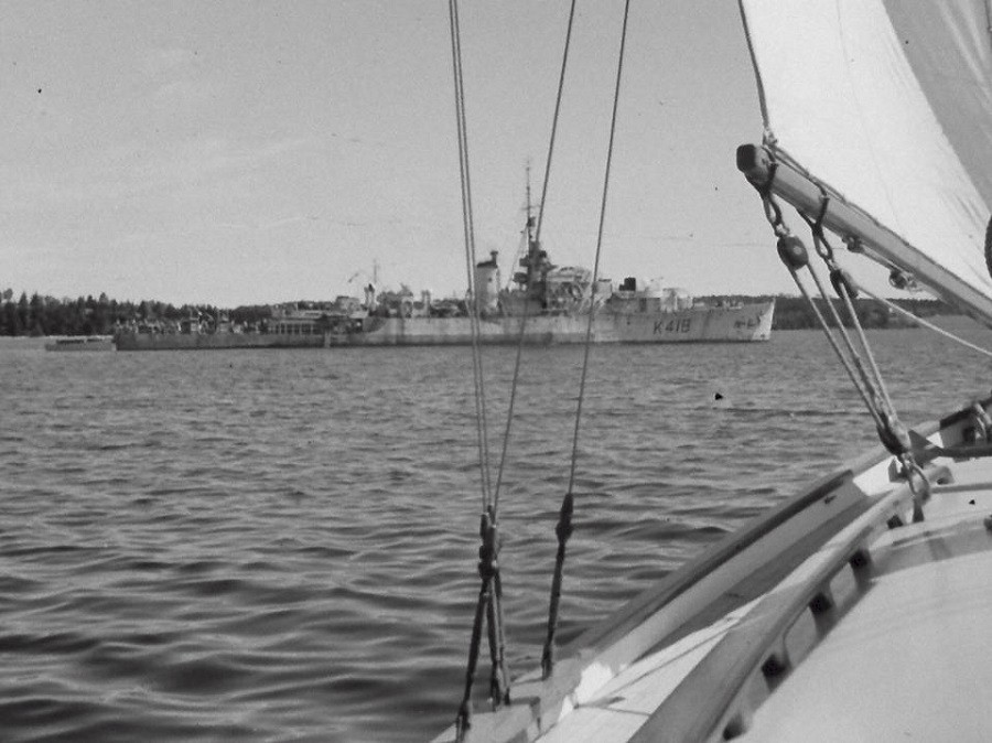 (JN001) HMCS JOLIETTE K418 in Mahone Bay, NS // "This photo is from a box of 110 square format negatives from an antique store purchased 22 Jan 2015. From the dates of the images in the box, this is probably summer of 1944 or 1945, and it looks to be in Mahone Bay, NS because that is where the gentleman photographer had his elegant sailboat." // Courtesy of John Newton, Rear-Admiral, RCN