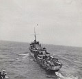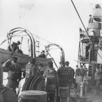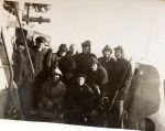 (PRC004) Patrick Casey (back left) with shipmates on unknown ship. Patrick Casey served in HMCS FENNEL and HMCS JOLIETTE. It is not known which of the two ships the photo was taken on. It has been entered on the pages for both ships. (PRC005) Sailors on HMCS JOLIETTE K418 // Webmaster's note: after comparing to other photos, this photo appears to have been taken on the starboard side of the boat deck immediately aft of the bridge. (PRC006) HMCS U-889 coming alongside HMCS JOLIETTE K418 in Shelburne, NS. From the collection of Patrick Casey, Coder, RCNVR Courtesy of Patricia Pollock