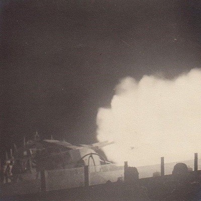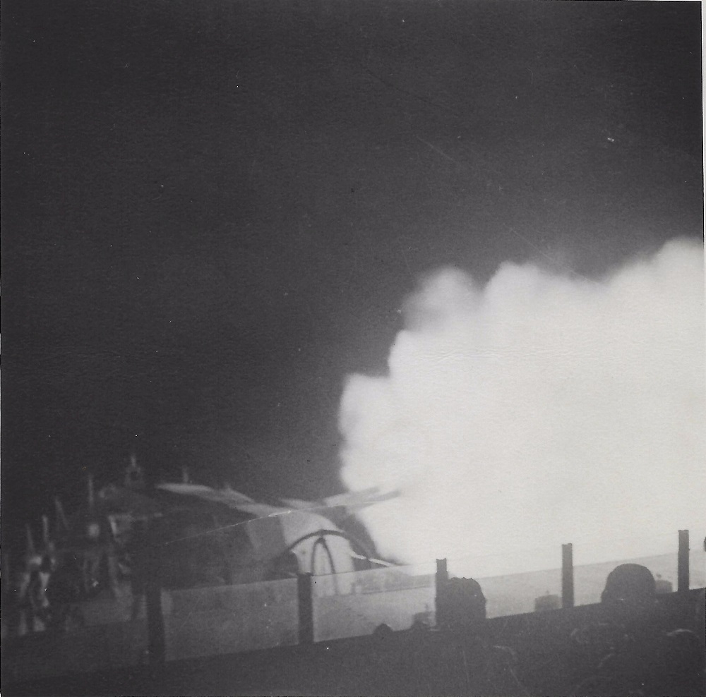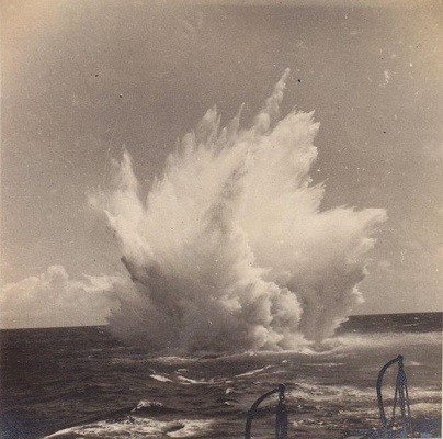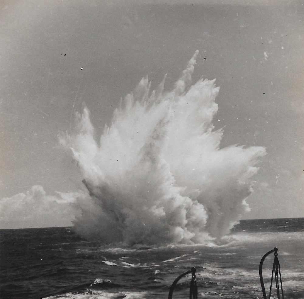 (16) Photo taken from the bridge of HMCS JOLIETTE K418 The ships in the centre are HMCS GATINEAU (left) and HMS TARBERT K431 at Tobermory circa Apr 1945 (17) Depth charge exploding astern of HMCS JOLIETTE K418 (18) HMCS JOLIETTE K418 conducting a night shoot (19) HMCS JOLIETTE K418 4" guns (20) HMCS JOLIETTE K418. Photo taken looking forward from the radar cabin