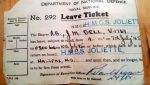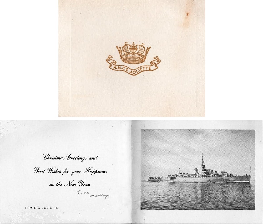 (1) Watch and Station booklet for James Murray Bell (2) Leave Ticket for AB J.M. Bell (3) James Murray Bell (left) and shipmate on HMCS JOLIETTE K418 (4) Sailors on HMCS JOLIETTE K418. James Murray Bell - back row 3rd from left (5) Christmas card from James Murray Bell - HMCS JOLIETTE K418