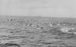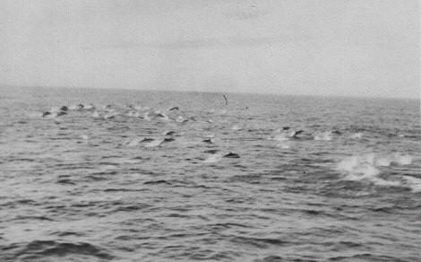 (GAO048) Porpoises following the ship (GAO049) A Convoy (GAO050) Unknown ship. Photo taken during 5 day cruise out of Bermuda. Possibly a work-ups consort. Jul/Aug 1944 (GAO051) HMS HYDRANGEA K39 - HMCS JOLIETTE in foreground (GAO052) "Our escort in the race"
