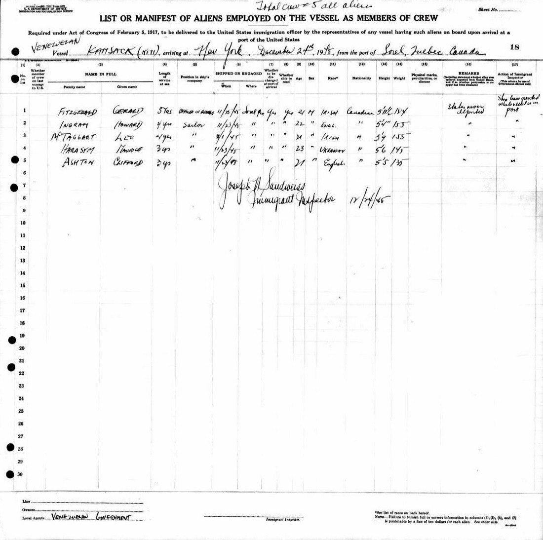 On 24 Dec 1945, the Venezuelan ship KAMSACK, former HMCS KAMSACK K171 arrived at New York City from Sorel, Quebec with a skeleton crew of RCN sailors: Gerald Fitzgerald OIC, Howard Ingram, Leo McTaggart, Maurice Harasym and Clifford Ashton.