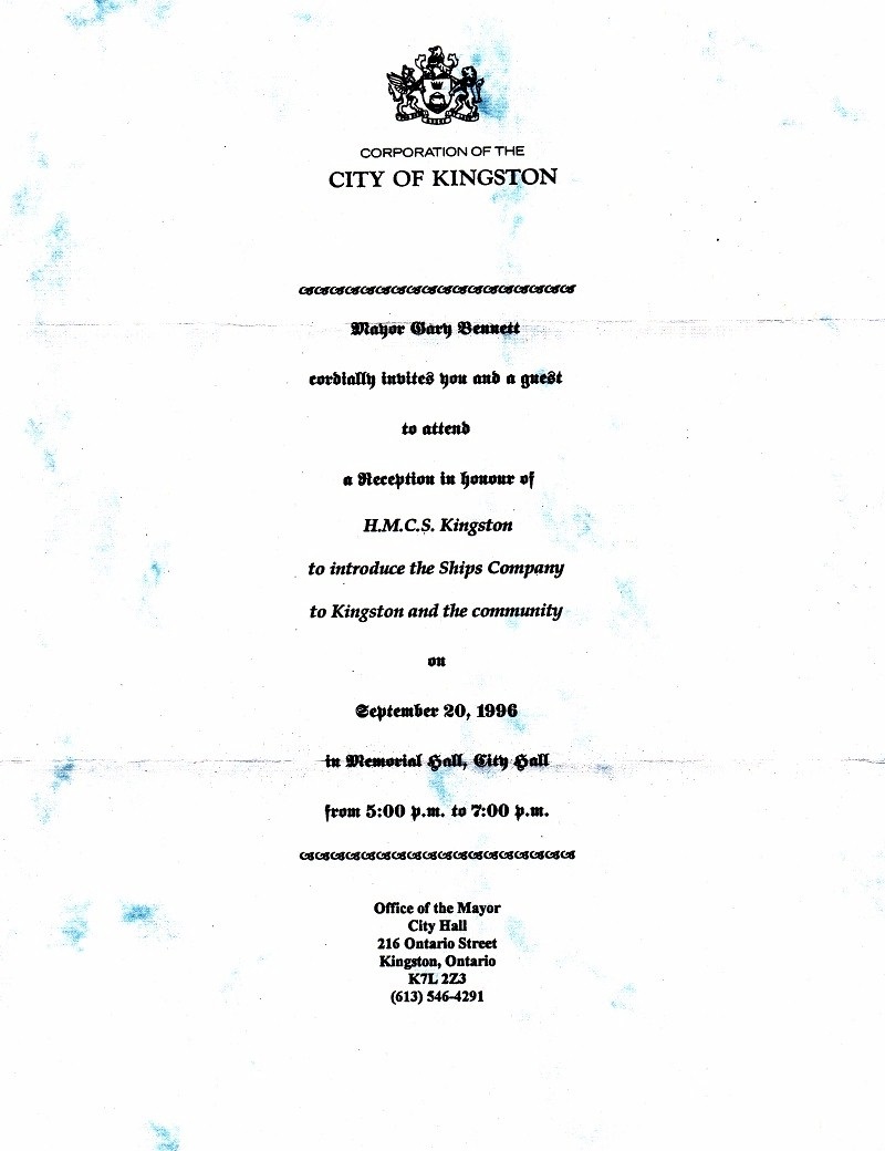 (KNG000 a & b) Invitation and programme for a Civic Reception to introduce the crew of HMCS KINGSTON on 20 Sep 1996