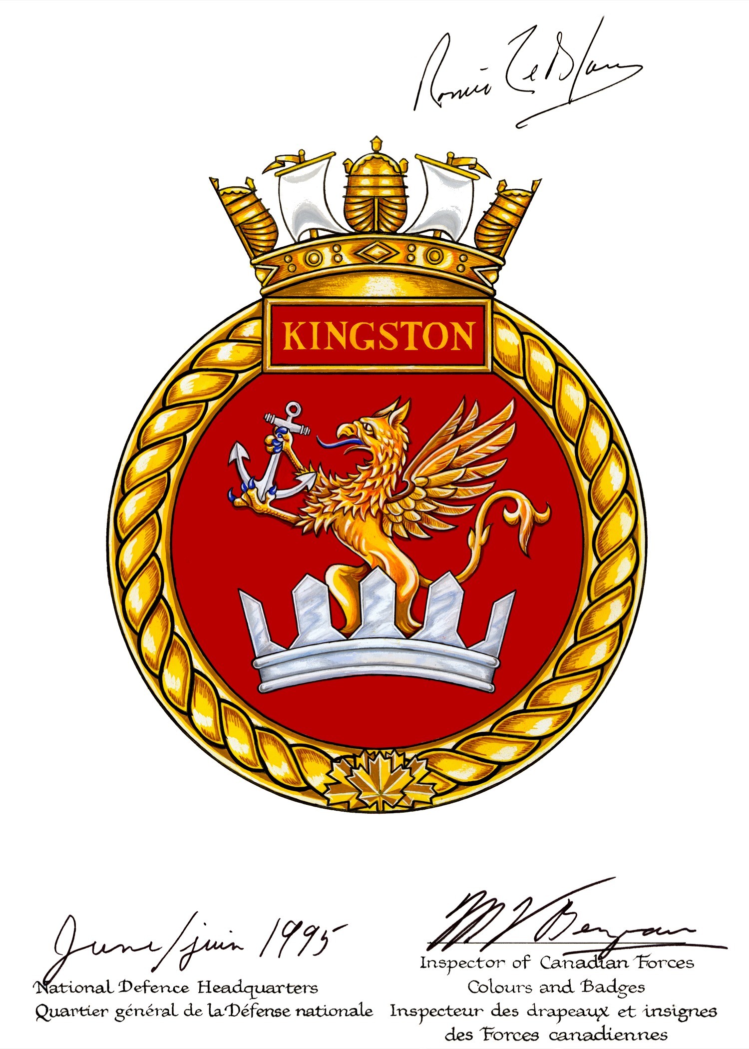 (KNG001) HMCS KINGSTON'S official badge (KNG002) HMCS KINGSTON in rough seas // DND-RCN photo (KNG003) HMCS KINGSTON 700 during work-ups in 2003 // Courtesy of Rick Bungay (KNG004) HMCS KINGSTON 700 coming alongside HMCS Summerside 711 in Halifax after work-ups in 2003 // Note the ice on the fo'c's'le of KINGSTON and Summerside. // Courtesy of Rick Bungay