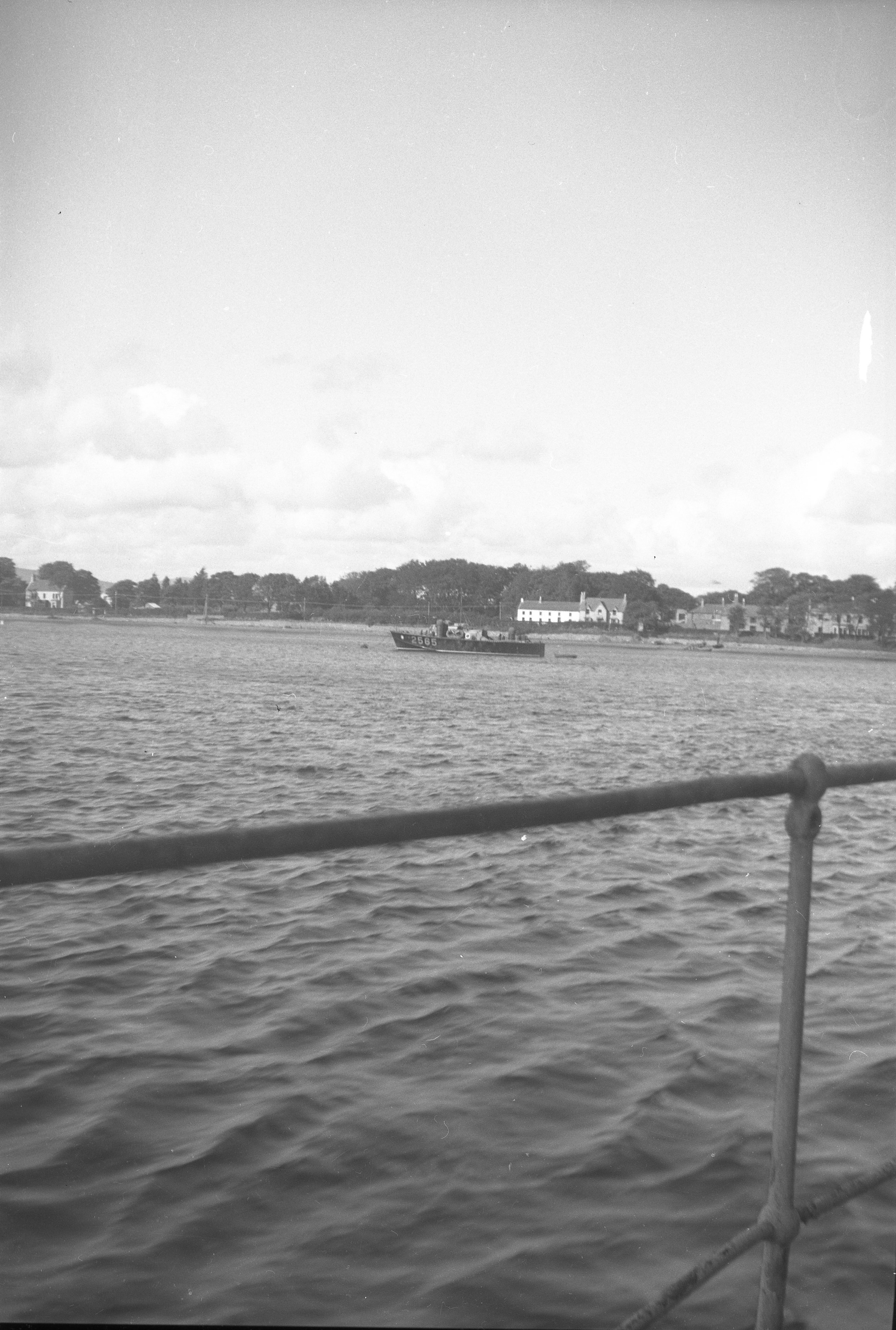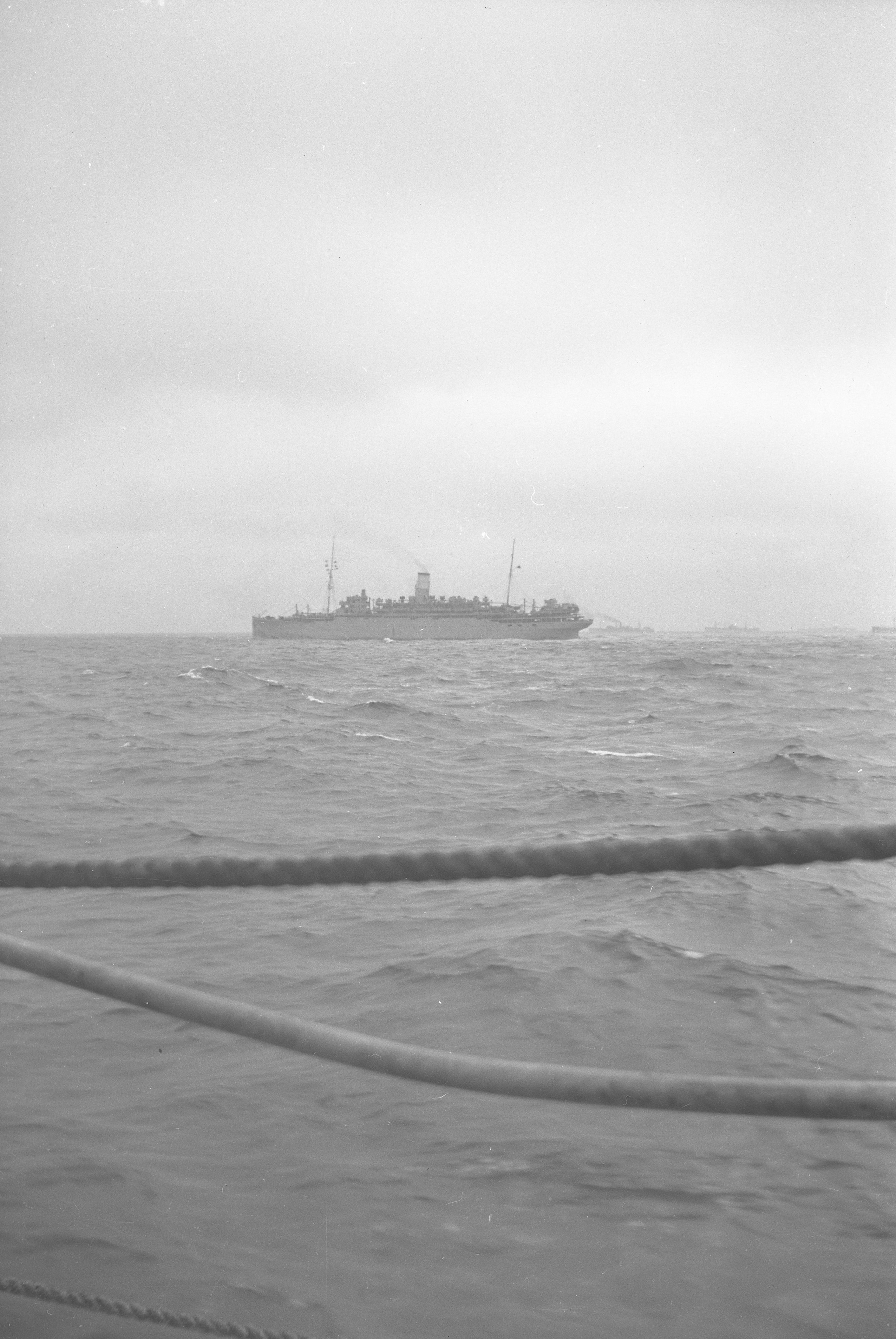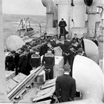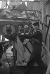 (GH06) Starboard side looking aft on HMCS KITCHENER K225 - unknown evolution with what appears to be 2 Wrens, furthest aft, centre of the photo (GH07) Three sailors by the depth charge thrower on HMCS KITCHENER K225. SBA Hinchcliffe on the left (GH08-GH09) AA gun on HMCS KITCHENER K225 (GH10) Unknown troopship in convoy