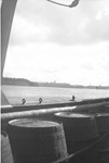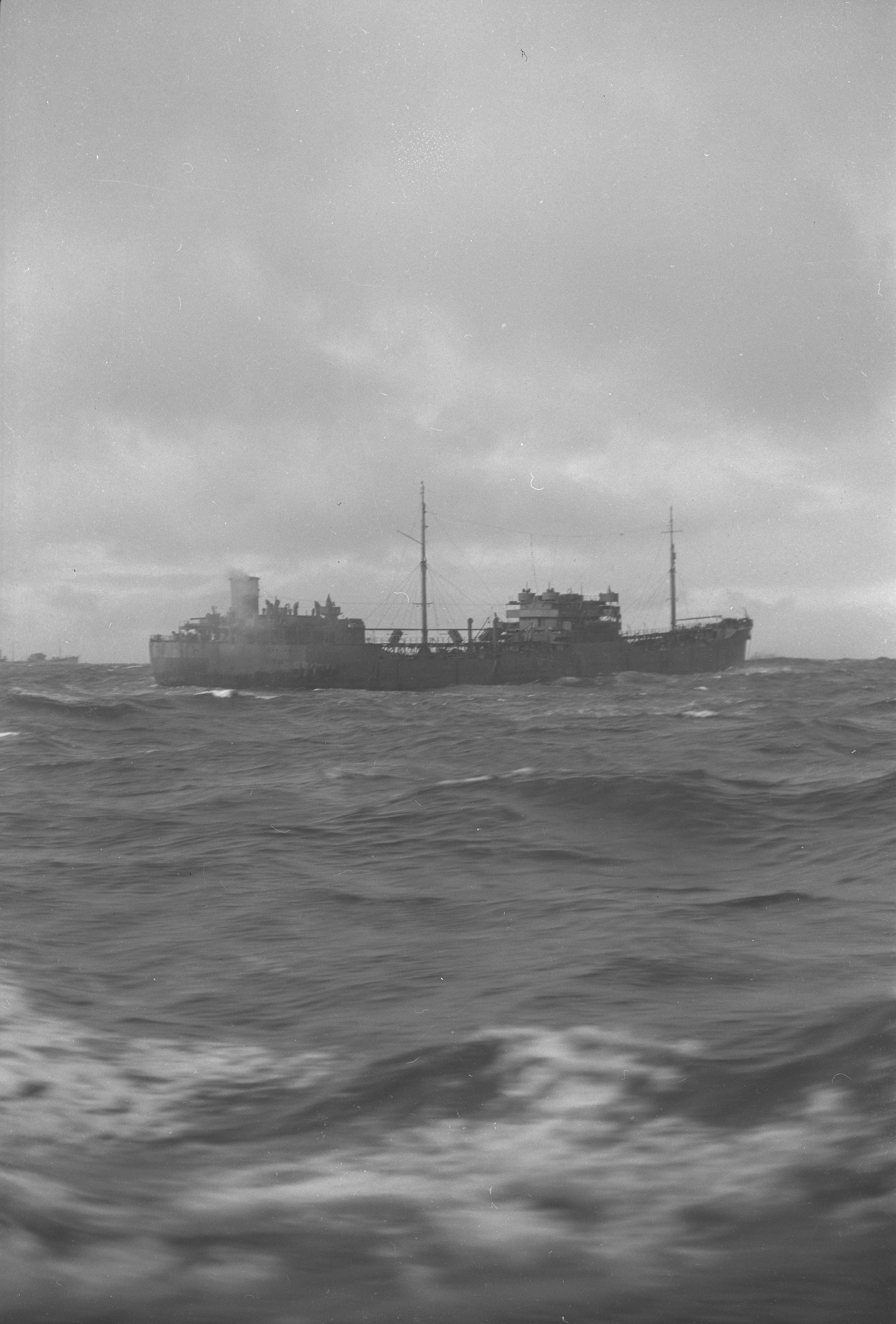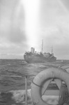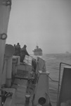 (GH11) HMCS KITCHEN K225 in position astern of an oiler in convoy. The position on the sailors on the fo'c's'le looks like they are preparing to receive a fueling line. (GH12-GH13) HMCS KITCHENER K225 moving off from the oiler (GH14-GH15) HMCS KITCHENER transiting the River Foyle, Northern Ireland