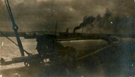 In this photograph, likely taken from HMCS Canada on the day following the Halifax Explosion, HMCS LADY EVELYN (centre) returns to port George Metcalf Archival Collection CWM 20080041-028