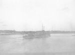 (JPB001) Front of HMCS LA HULLOISE Christmas Card // Webmaster's note: This photo is actually a photo of HMCS STETTLER with the pendant number on the ship's side removed and the details on the signal flags obscured. This was common when printing Christmas Cards for the ships during the war as having a stock photo of the class was more efficient than getting individual photos for each ship as most people would not notice any difference. Photo JPB002 is a copy of the original photo showing STETTLER'S pendant number (K681) on the hull and by signal flags. (JPB003) HMCS LA HULLOISE K668 conducting engine trials on the Kennebecasis River off Rothesay, NB 04 Oct 1945. LCdr John Brock, DSO, C.O. (JPB004) HMCS LA HULLOISE passing going under the Reversing Falls’ road and railway bridges on her way to Indiantown, about 1 km upstream for work at a small yard off Bridge Street. Note the 3 tugboats assisting in LA HULLOISE'S short trip. The Reversing Falls can only be traversed at slack tide between low and high tide and there is only about a 20 minute window, 4 times daily. From the collection of LCdr John Brock Courtesy of Leonard Lee-White