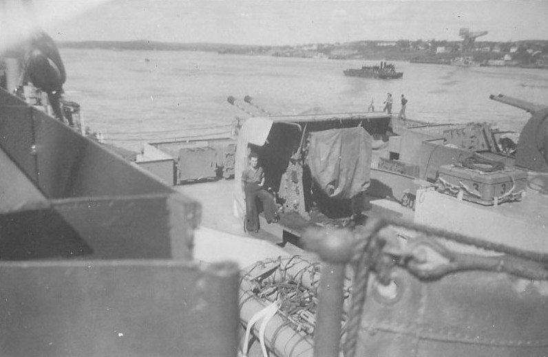 (TJS001) HMCS LA HULLOISE K668 entering Gladstone Dock, Liverpool (TJS002) Rowing Crew of HMCS LA HULLOISE K668 (TJS003) HMCS LA HULLOISE K668 (TJS004) HMCS LA HULLOISE in the slips - location unknown // Photographer: Thomas J. Simpson // © the collection of Thomas J. Simpson (TJS005) The Big Guns on HMCS LA HULLOISE K668 // Twin QF 4-inch MK XIX Naval Guns with friends of Thomas J. Simpson // Photo taken by Thomas J. Simpson // © Thomas J. Simpson From the collection of Thomas J. Simpson