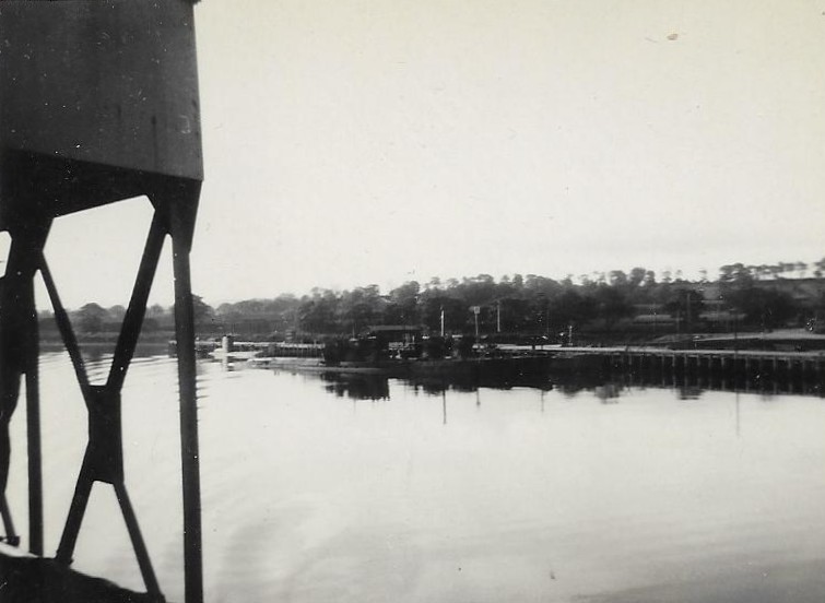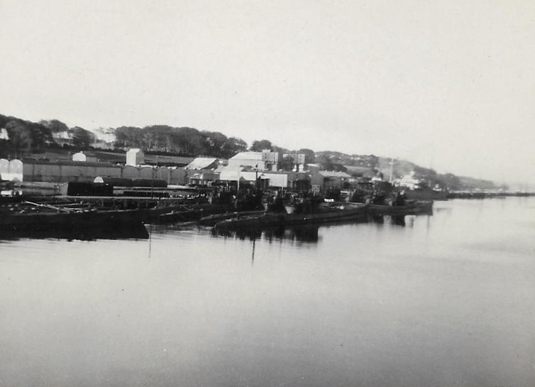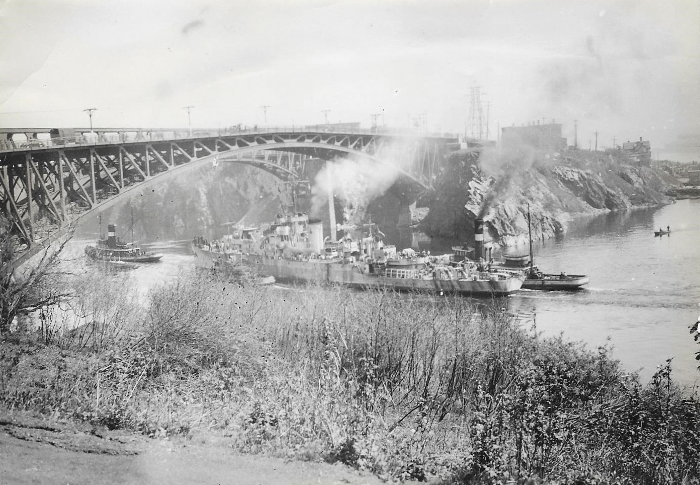 (WHV088) Gibraltar harbour seen from HMCS LA HULLOISE K668 (WHV089-WHV090) Surrendered U-boats at Lisahalley, Northern Ireland (WHV091) HMCS LA HULLOISE K668 passing going under the Reversing Falls’ road and railway bridges on her way to Indiantown, about 1 km upstream for work at a small yard off Bridge Street. Note the 3 tugboats assisting in LA HULLOISE'S short trip. The Reversing Falls can only be traversed at slack tide between low and high tide and there is only about a 20 minute window, 4 times daily.