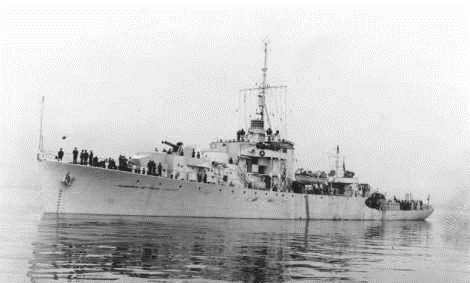 Commissioned at Quebec City on 21 Jul 1944 she arrived in Bermuda at the end of Aug 1944 to work up, and a month later left for Halifax to join the newly formed EG 27. She spent the balance of the war with the group, on patrol and escort duty out of Halifax, and on 04 Jun 1945 commenced tropicalization at Lunenburg, N.S. The work was completed 26 Nov 1945 and she sailed a month later for Esquimalt, arriving 30 Jan 1946. Paid off on 15 Feb 1946 to reserve there, she was sold in 1947 and her hull expended the following year as part of a breakwater at Oyster Bay, B.C.