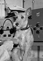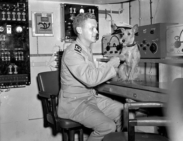 SLt A-Roberts with Able Seaman Terry, the mascot of the frigate HMCS LEVIS,
