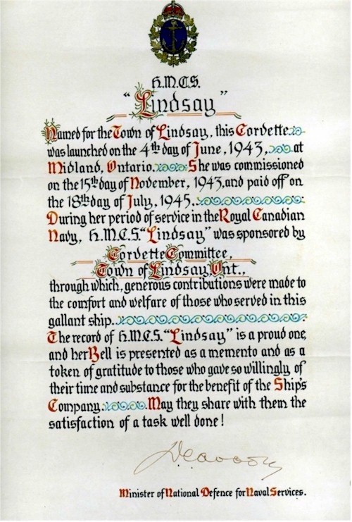 Commander, Maritime Command to the wartime crew of HMCS LINDSAY on