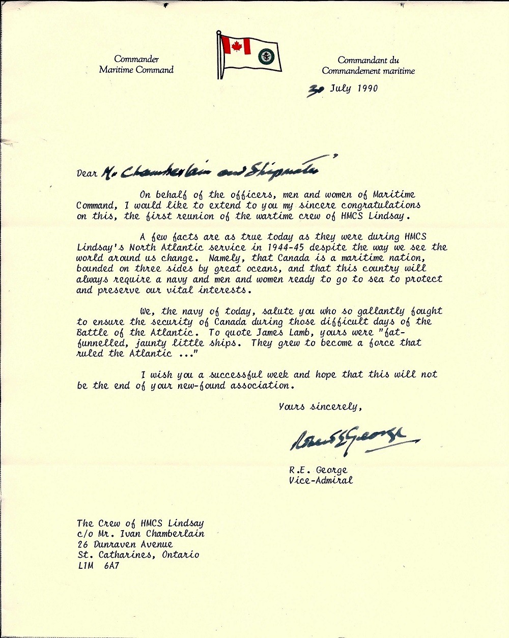 Letter from Vice Admiral R.E. George,