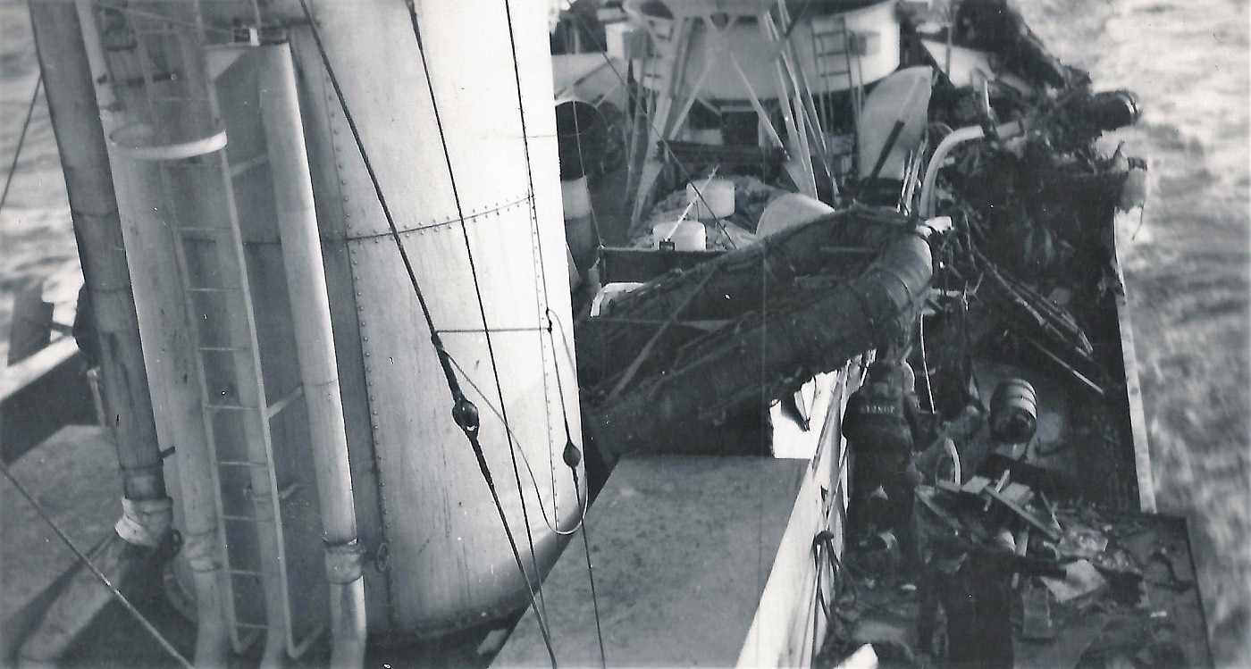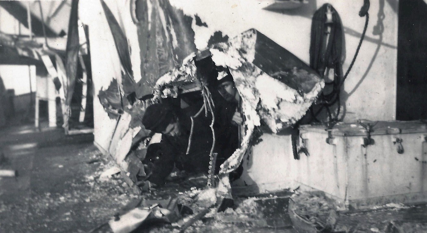 (7) Hole in boiler room covered with canvas (8) Twisted depth charge