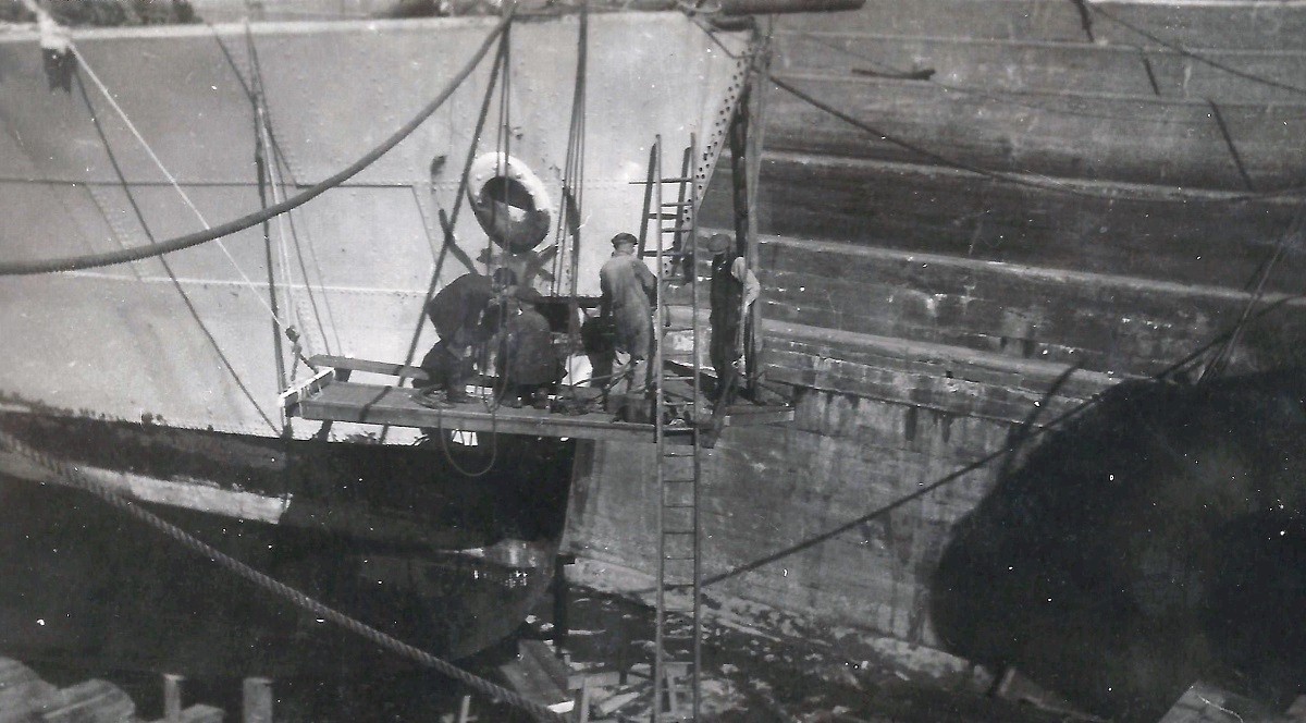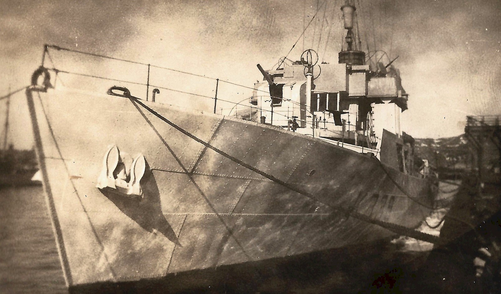 preparing for refit. Note that her 4-inch gun has been removed.