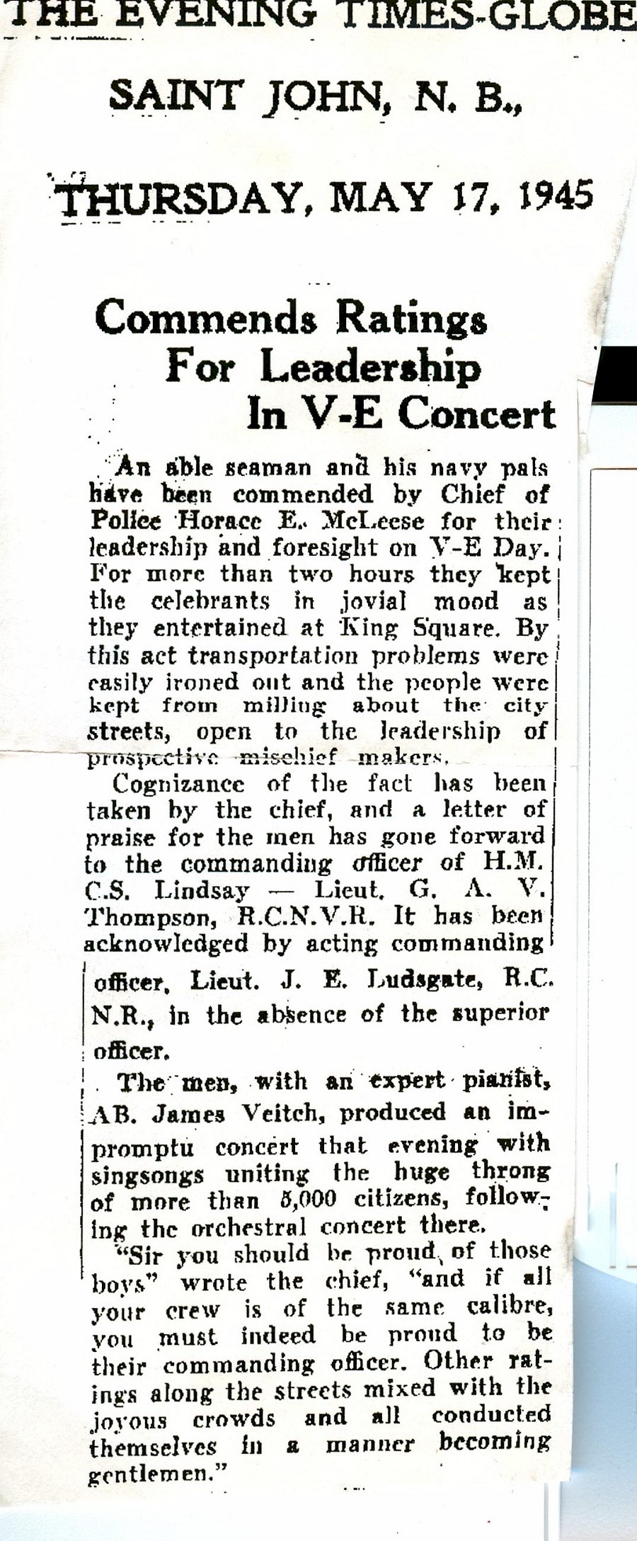 commended for impromptu V.E. Day concert in Saint John, NB.