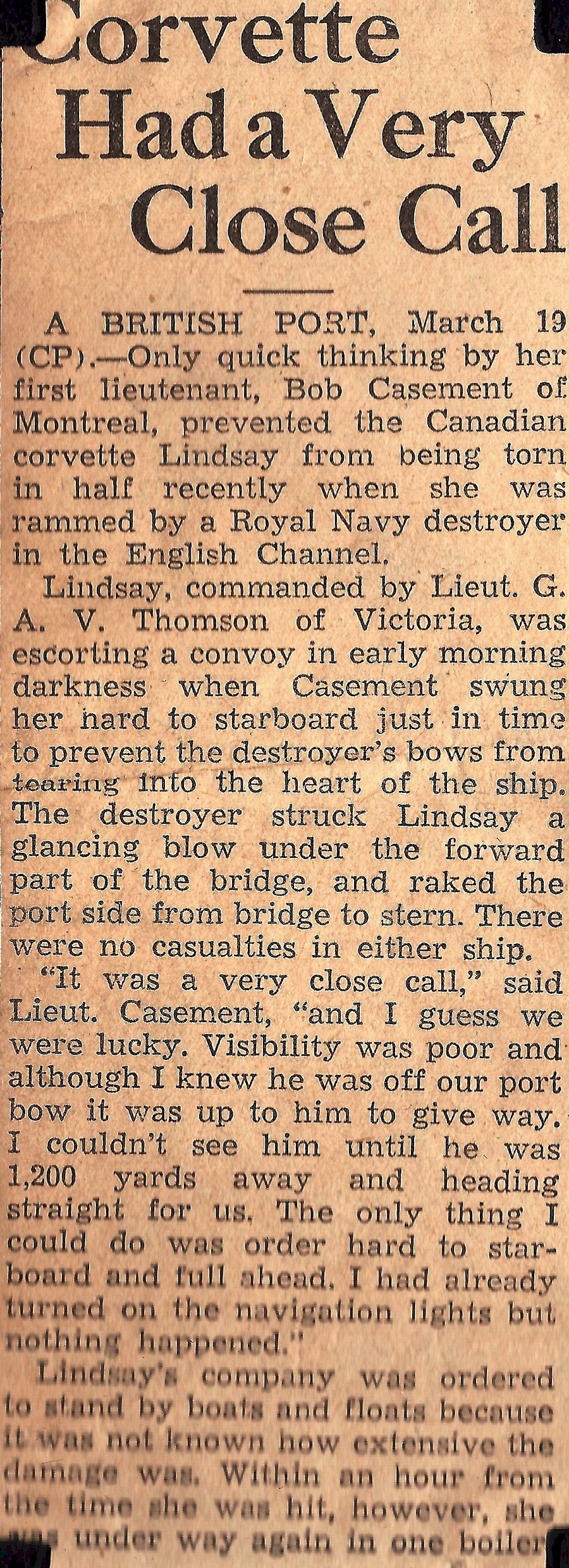 Newspaper article on the collision between HMCS LINDSAY and HMS Brilliant