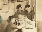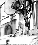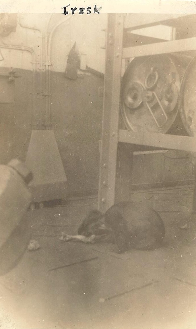 (HM06) Irish - mascot of HMCS LONG BRANCH K487 (HM07) Unknown officer with ship's mascot Irish on HMCS LONG BRANCH K487 (HM08) Dhobey (Laundry) day aboard HMCS LONG BRANCH K487. Webmaster's note: These sailors look a little too happy doing laundry. It appears to be a public relations "staged" photo.