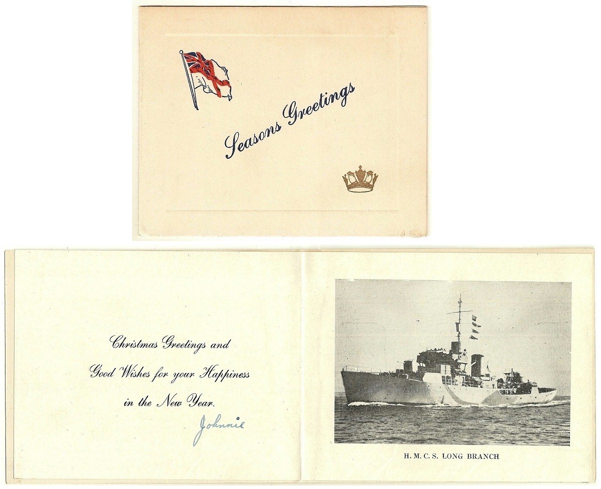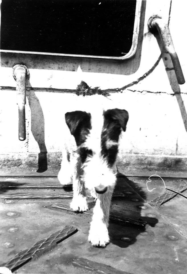 (LGB001) HMCS LONG BRANCH K487 underway again // Photo taken from HMCS ROSTHERN on 21 Apr 1944, 600 miles west of Ireland. ROSTHERN had transferred a new spare air valve via wire hook-up between ships. ROSTHERN provided protection to LONG BRANCH while she effected the repairs - sitting motionless for 6 hours. Note the C5 Barber Pole on the LONG BRANCH'S funnel // From the collection of Reese Berwyn Davies, Lt, RCNVR // Courtesy of Dale Davies (LGB002) Chief Puppy Officer Rivets // Ship's mascot of HMCS LONG BRANCH K487 // Courtesy of the CFB Esquimalt Naval and Military Museum Photo #VR2016.78.53 (LGB003) HMCS LONG BRANCH K487 Christmas Card // Courtesy of Hugh Muir (LGB004) HMCS LONG BRANCH K487 // From the collection of Ron Critchley // Courtesy of Diane Brown (LGB005) Bollard, mascot of HMCS LONG BRANCH K487 // Courtesy of the CFB Esquimalt Naval and Military Museum - photo # VR2016.78.131