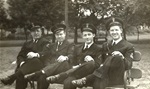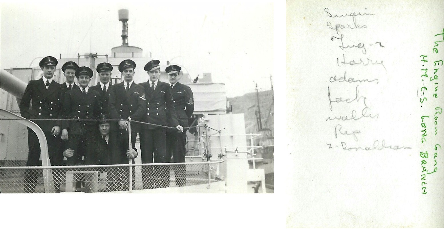 (JS04) Shipmates ashore at "the rest camp" (JS05) Jack Shunk (1st on right) with shipmates (JS06) Jack Shunk (1st on left) with shipmates (JS07) Engine Room gang on HMCS LONG BRANCH (8) names on back of photo: Swain, Sparkes, Tug 2, Harry, Adams, Jack, Wallis, Rip, Donaldson 2 // Note: Jack Shunk is listed on the back of the photo - but is not in the photo - he was the photographer