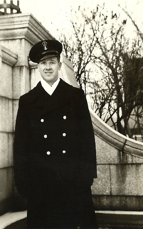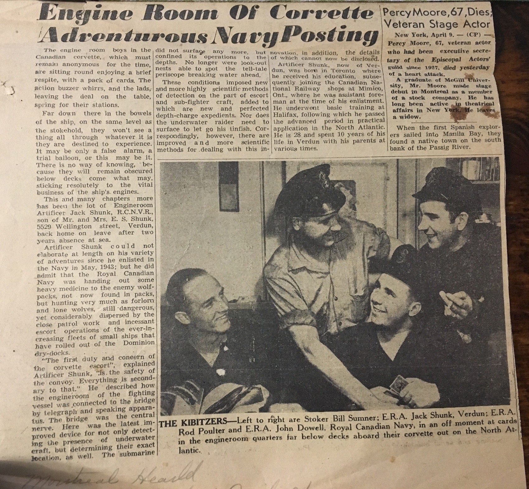 Newspaper article from the Montreal Herald on HMCS LONG BRANCH K487 // Listed in the article: Stoker Bill Sumner, ERA Jack Shunk, ERA Rod Polter and ERA John Dowell // Courtesy of Randy McKee (grandson of Jack Shunk) and Doug Shunk RCN Branch 101 Lapel pin honouring HMCS LONG BRANCH K487 // Courtesy of Doug Shunk From the collection of Jack Shunk Courtesy of Lorne Shunk, Doug Shunk and Randy McKee