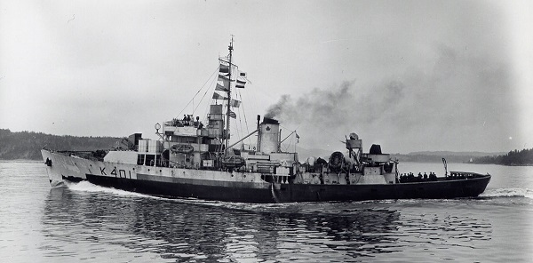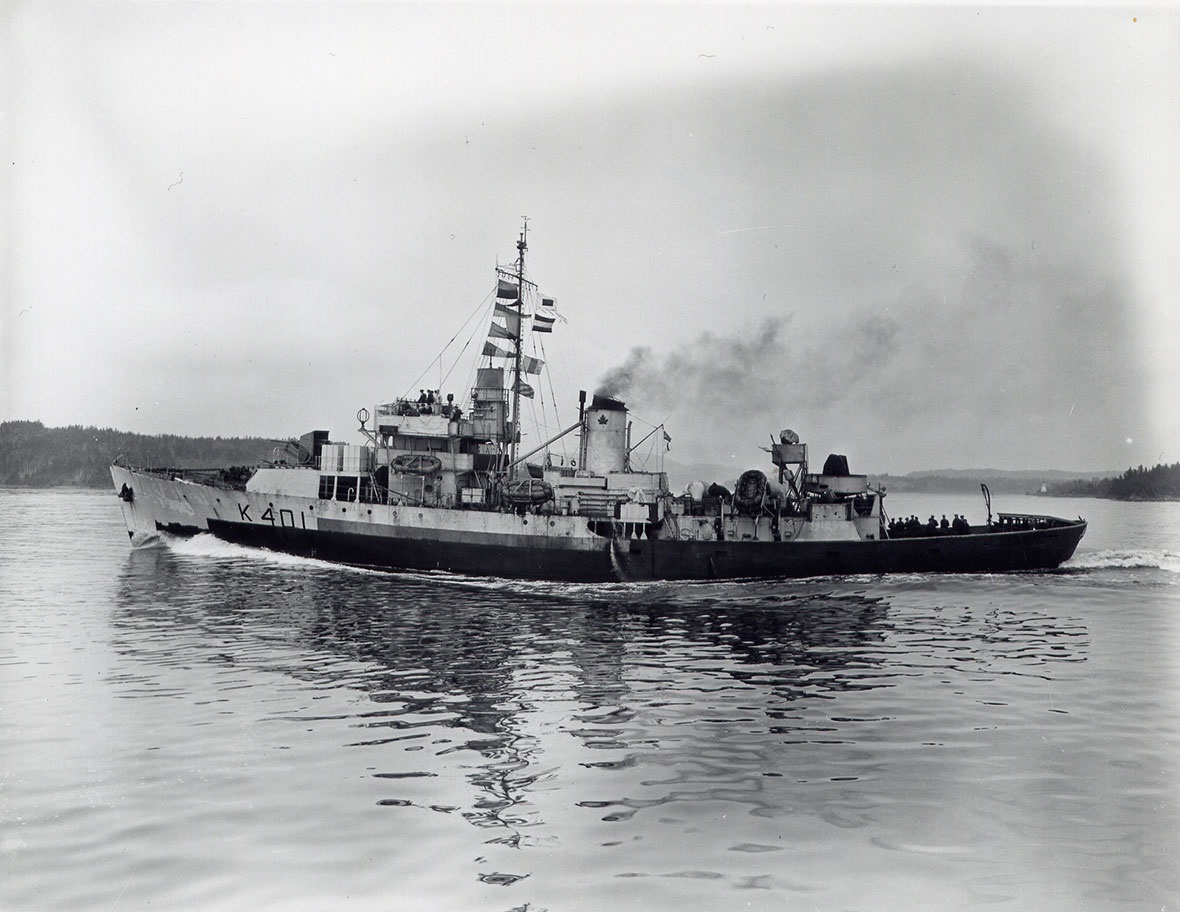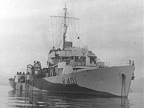 Built at Quebec City, she was launched on 13 Jul 1943 and commissioned there on 13 Dec 1943. She sailed to Halifax in advance of completion in order to escape the freeze-up, arriving in late Dec 1943, and was not ready for service until Feb, 1944. Late in Mar 1944 she went to Bermuda for workups and upon returning to Halifax was assigned as an unallocated unit to Western Approaches Command, Londonderry. She sailed for the U.K. on 23 Apr 1944 and spent the next four months on escort duties associated with the invasion. In Sep 1944 she was allocated to EG 41, Plymouth, and late in Mar 1945, returned home for refit at Saint John. Upon completion of this refit she was paid off at Sorel on 25 Jun 1945 and placed in reserve there. She was sold in 1947 to the Dominican Navy and renamed JUAN ALEJANDRO ACOSTA. Deleted from active list in 1978, she was driven ashore in a hurricane on August 31, 1979 alongside her sister COLON (former HMCS LACHUTE).