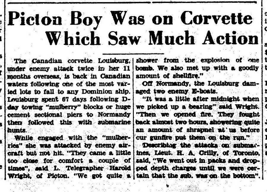 (LSB002) Picton Boy Was on Corvette Which Saw Much Action  //  Newspaper article on L/Tel Harold Wright of Picton and Lt H.A. Crilly of Toronto serving in HMCS LOUISBURG K401  //  Picton Gazette 13 Apr 1945  //  Source: Prince Edward County Archives Microfilm collection  //  Researched and complied by: © John Lyons 2018