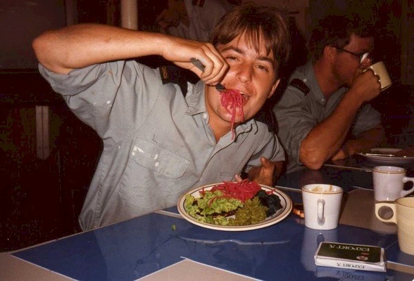 (BR05) HMCS MACKENZIE'S Tadpole Breakfast for Crossing the Equator during Ex SOPLOY '82 (BR06) OSBN Bruce Roper enjoying his tadpole breakfast prior to the Crossing the Line Ceremony during Ex SOPLOY '82