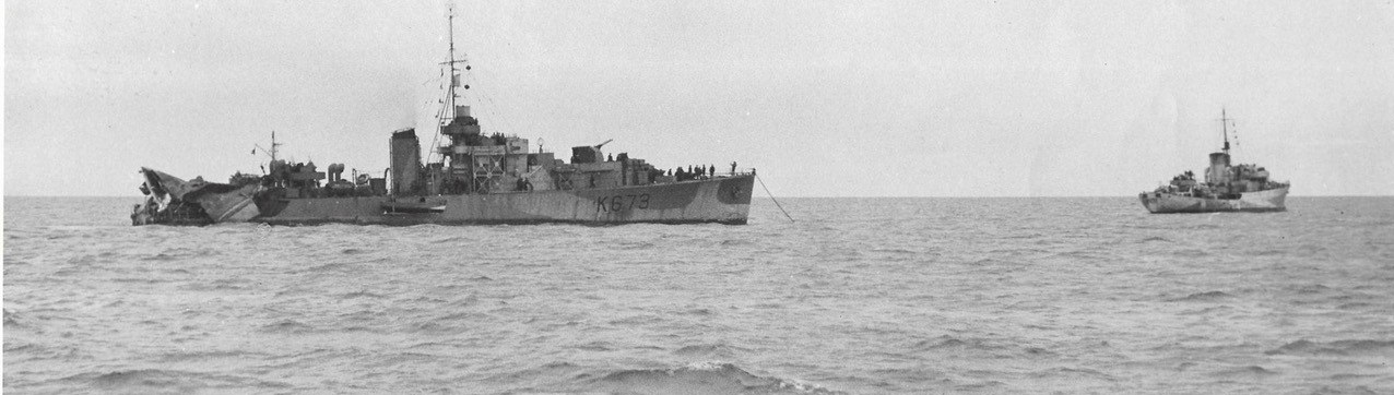 HMCS Magog under tow by HMCS Shawinigan - 14 Oct 1944
