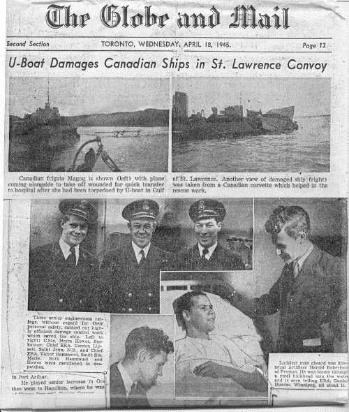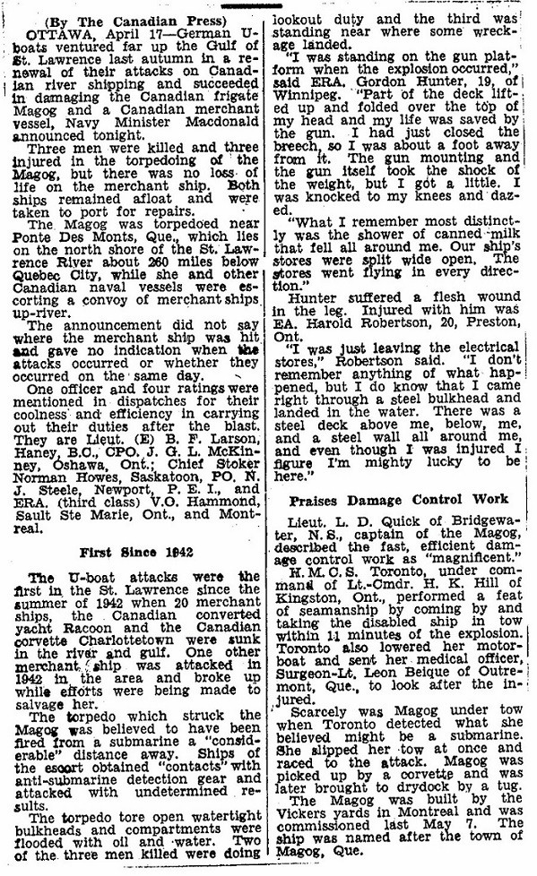 Wednesday, April 18, 1945 on the torpedoing of HMCS Magog