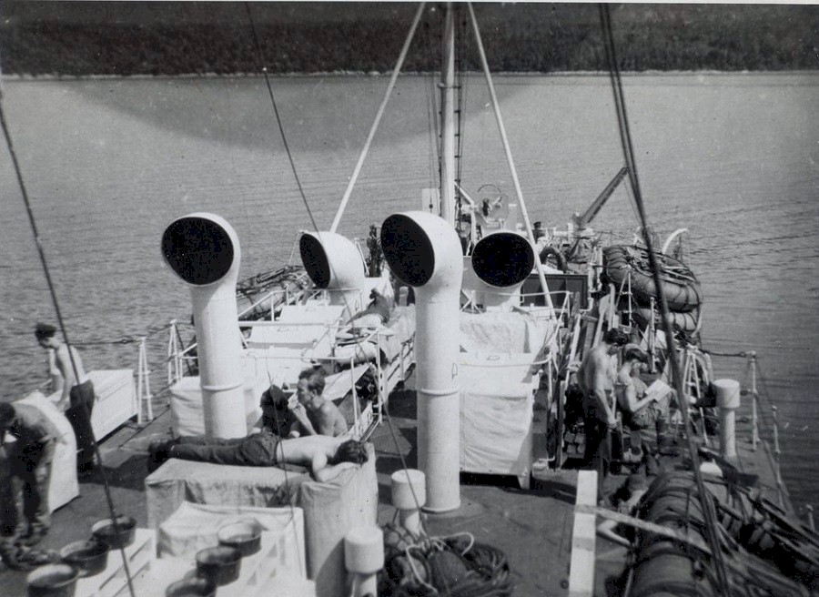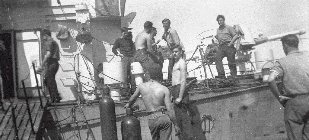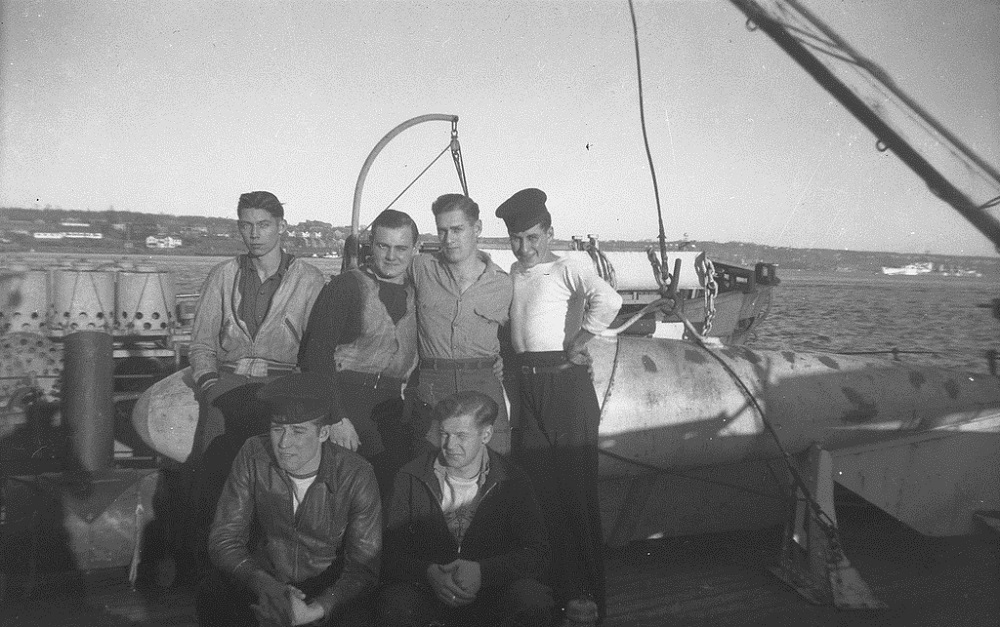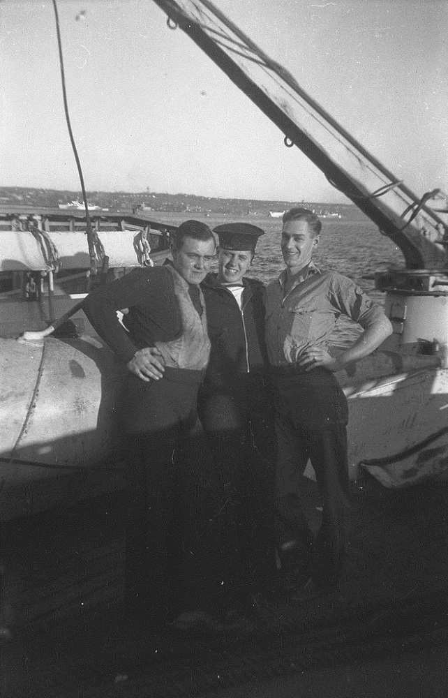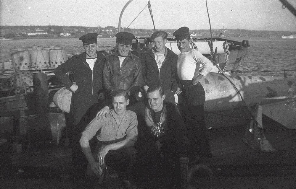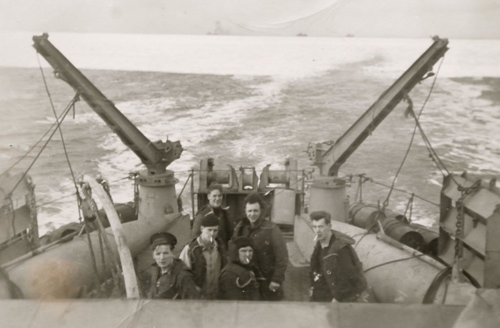 (LF06) Les Fontaine (left, sitting of paravane) and shipmates on