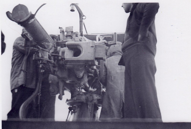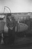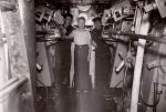 MAHONE, Spring, 1943. 4-inch shell being rammed home. Photo taken from the ammunition hatch. The