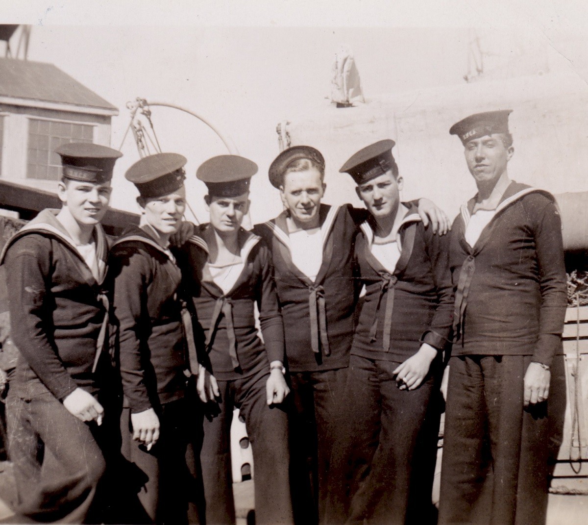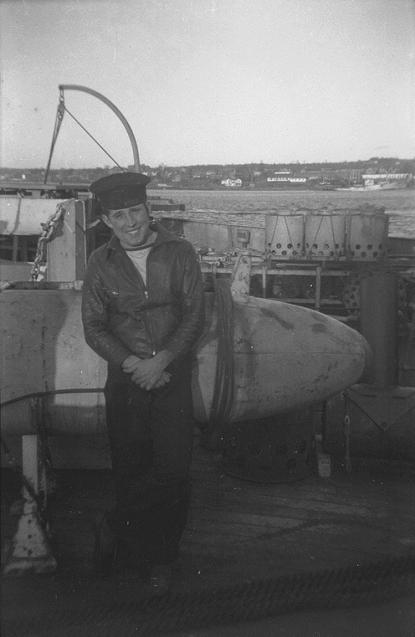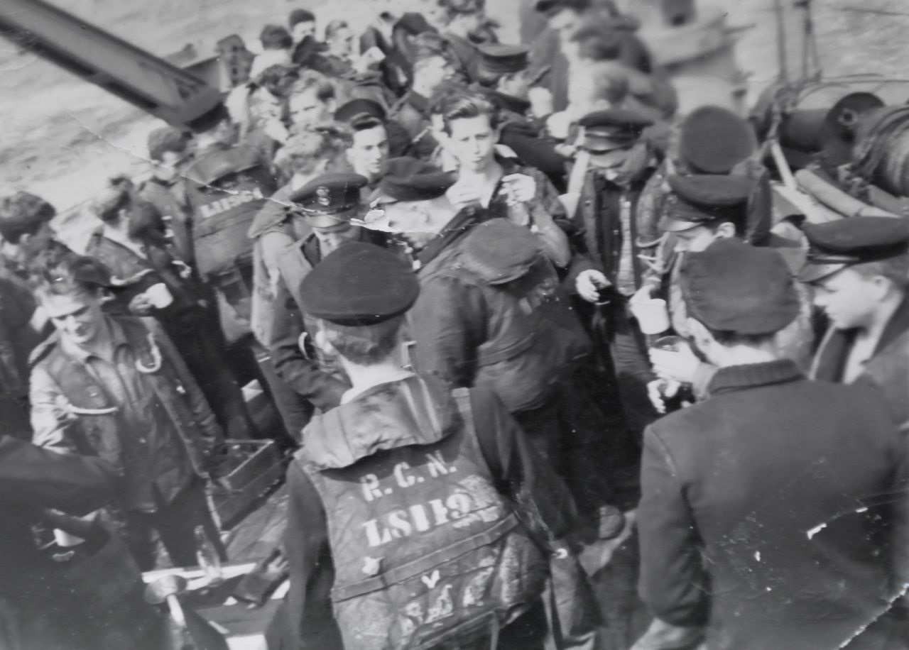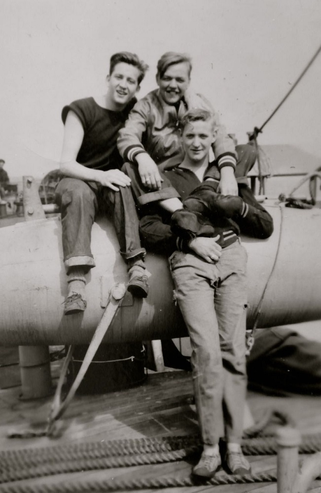 VE day at sea on HMCS MAHONE. Les Fontaine, centre, facing