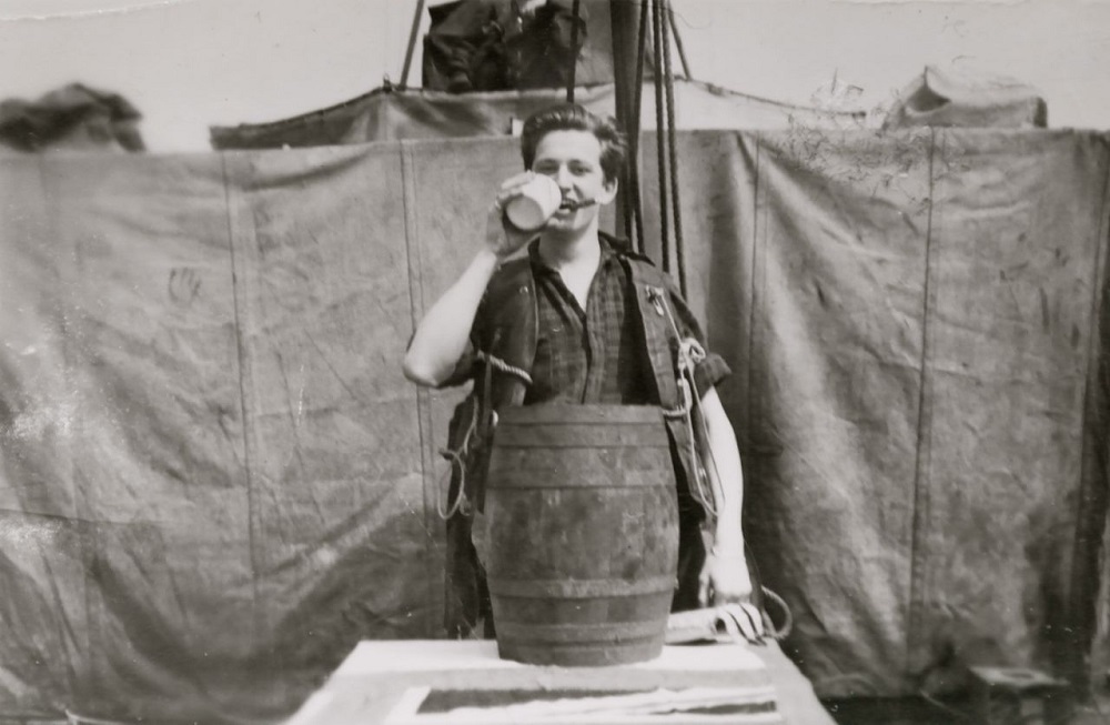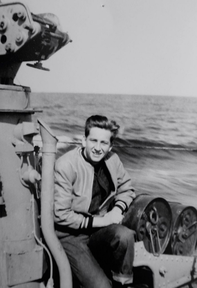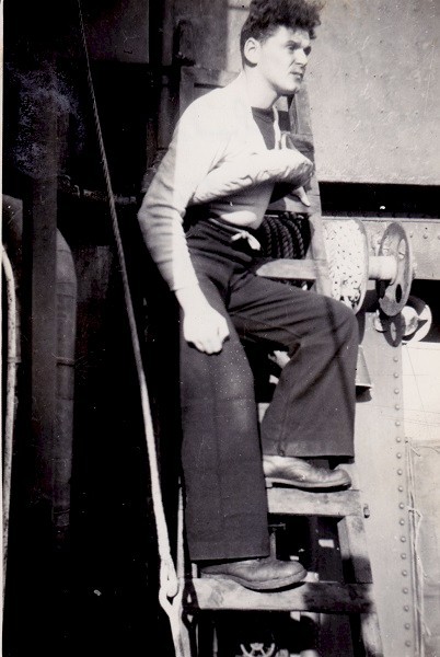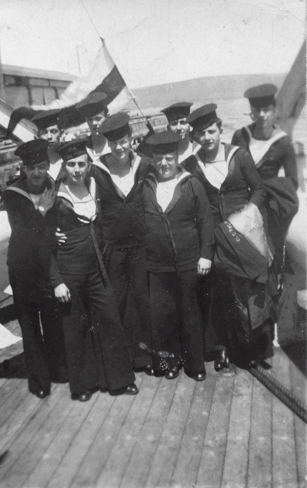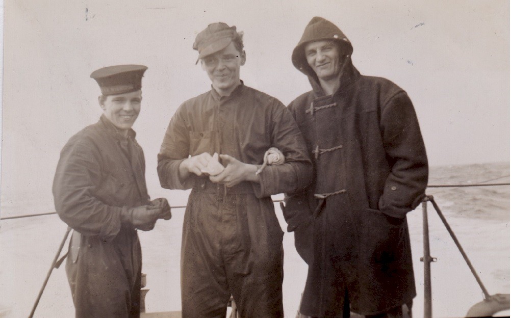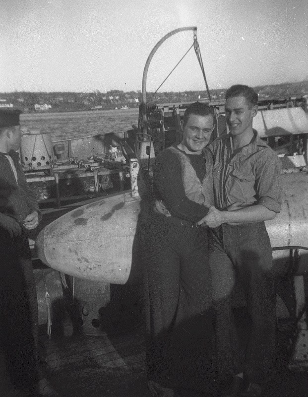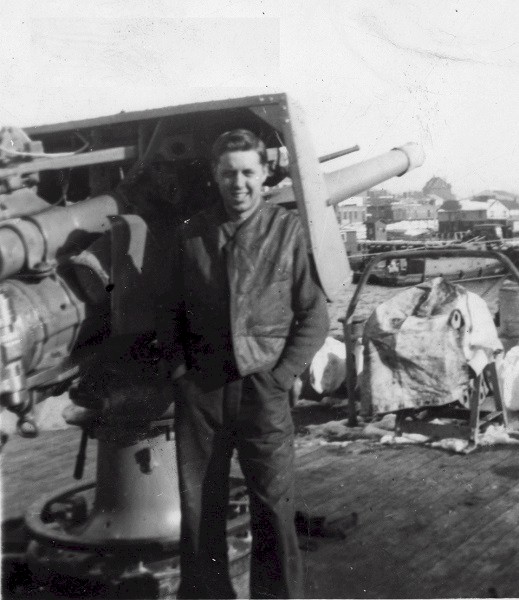 VE day at sea on HMCS MAHONE. Les Fontaine, centre, facing
