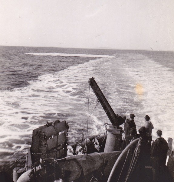 Depth charge practice, HMCS MAHONE, Circa 1942 - On back of photo "Ring left by depth