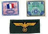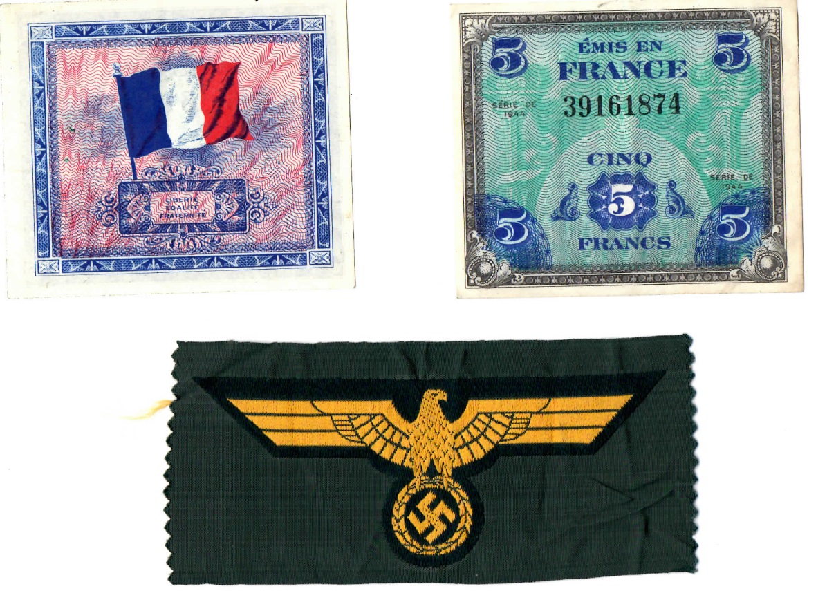 Invasion money and badge taken as a souvenir from