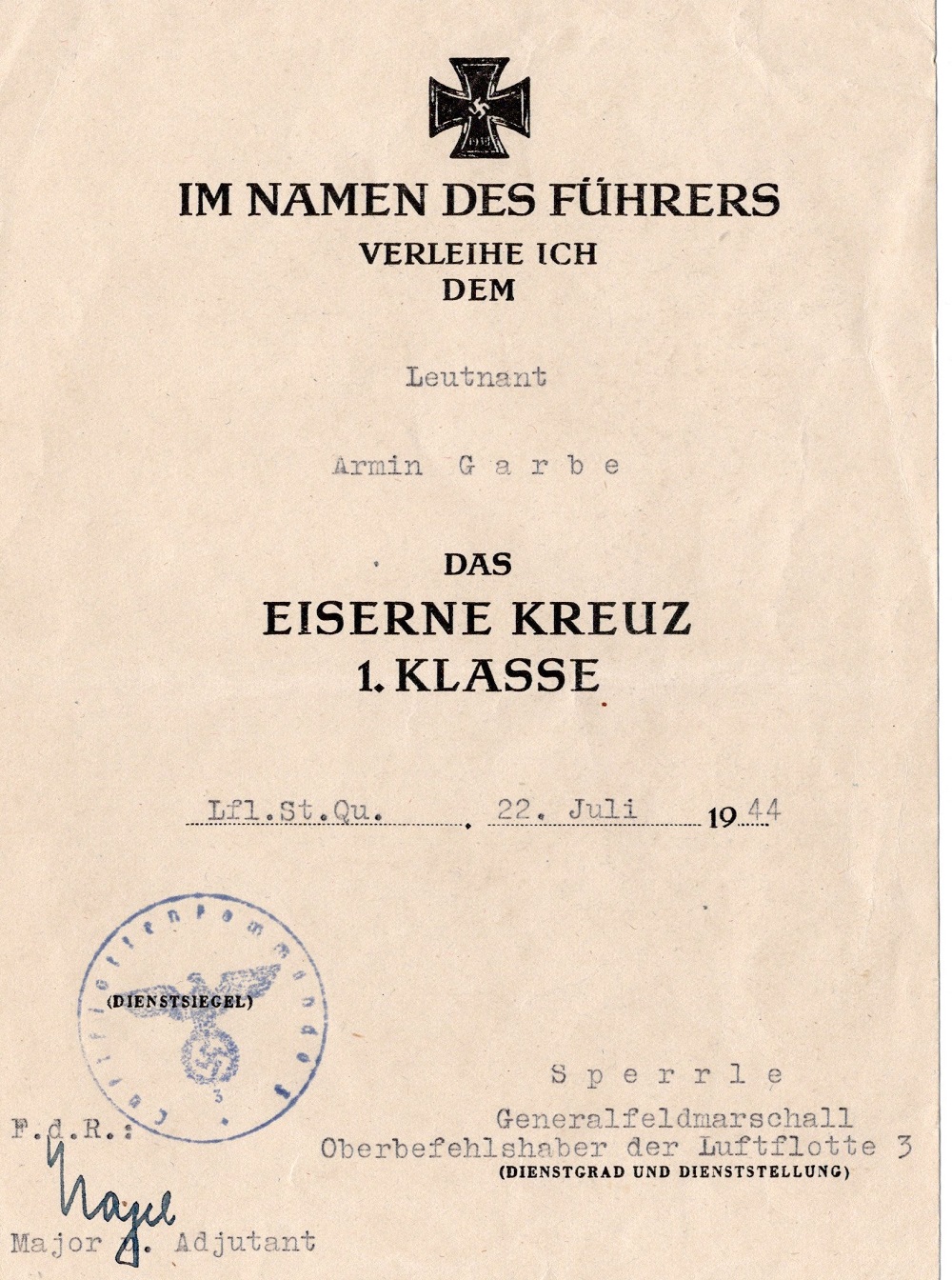 GARBE, Armin. (DOB: 07.07.20). (W.B.K. Chemnitz I). 01.03.43 promo