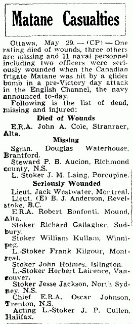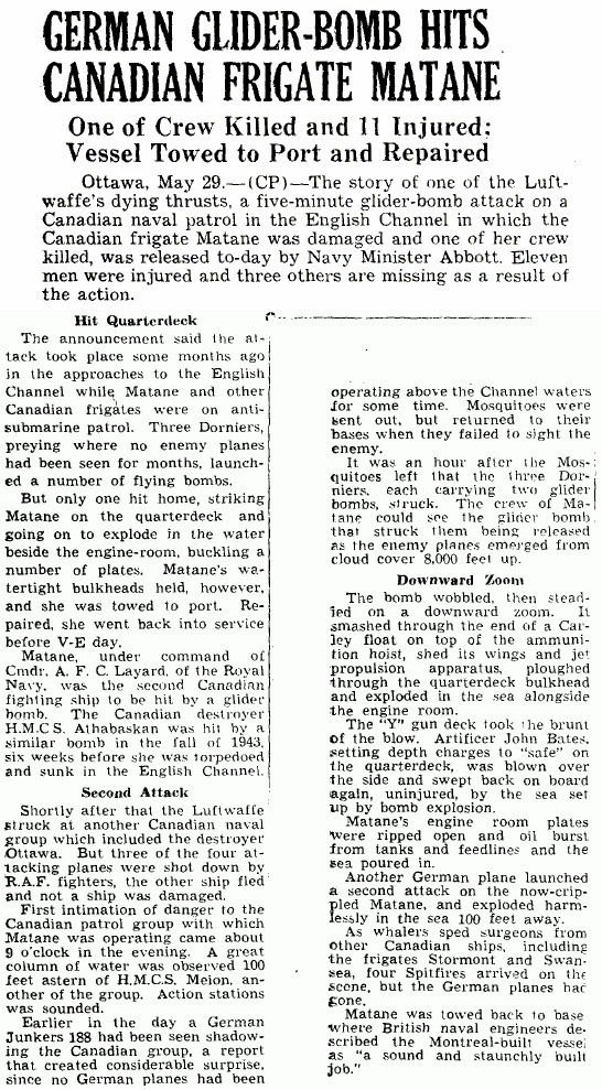 a glider bomb (ML02). Note: HMCS MATANE was damaged in the