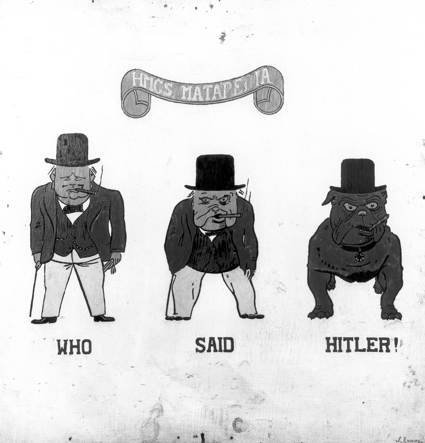 (WB20) Gunshield art on HMCS MATAPEDIA K112  (WB21) Unknown sailor by the depth charge thrower on HMCS MATAPEDIA K112  (WB22) Sailors holding HMCS MATAPEDIA'S tally plate.  Names listed are assumed to be L-R.  Fricke (from Cape Breton), T. Lawless (from Newfoundland), Sloan (from Montreal), and Hitchcock (from Vancouver)  (WB23) Tuphon, ASDIC (from Toronto)  (WB24) Unidentified sailor in a bosn's chair